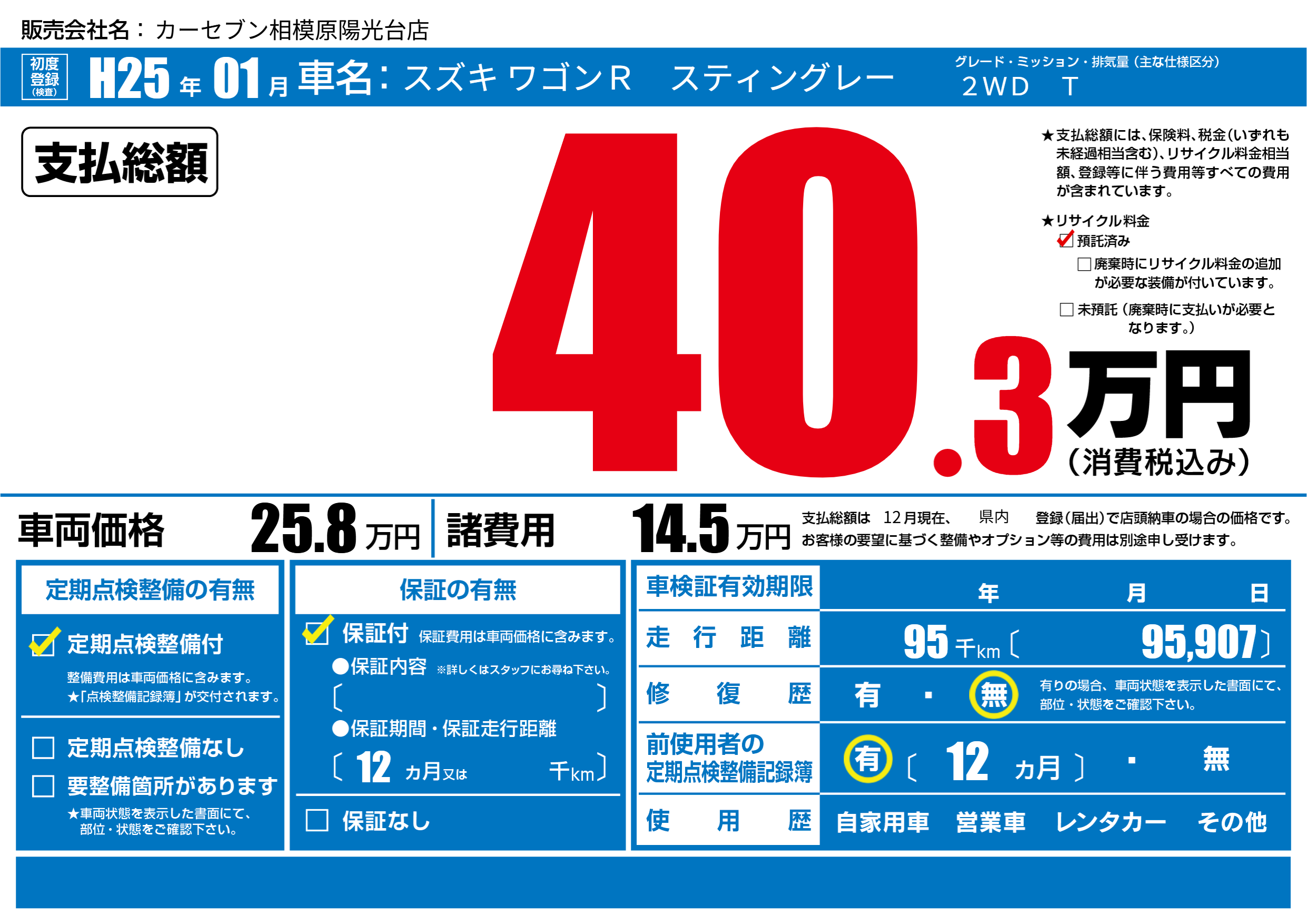 | 走行キロ | 9.5万km | 初年度登録 | H25年01月 |