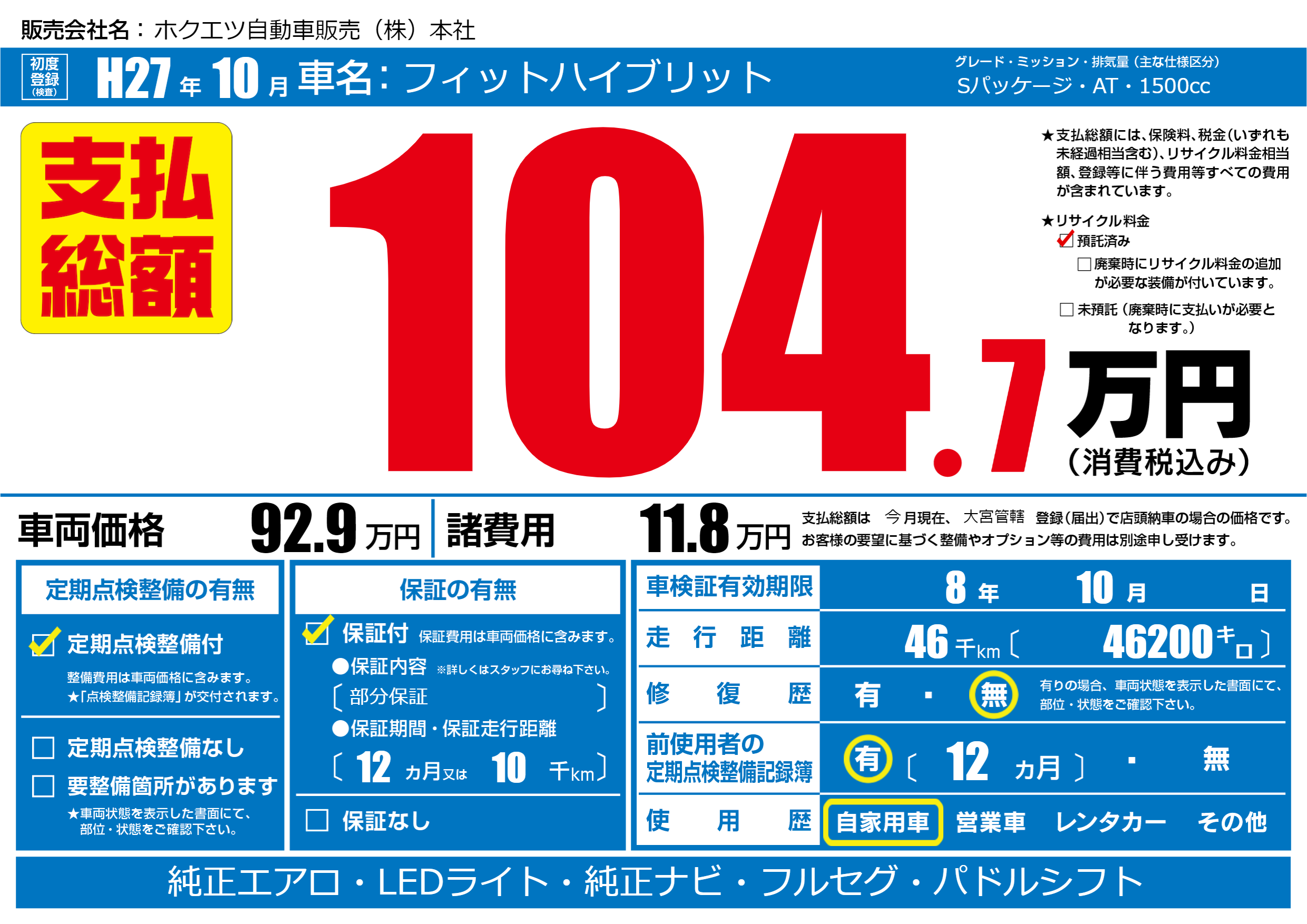 | 走行キロ | 4.6万km | 初年度登録 | H27年10月 |