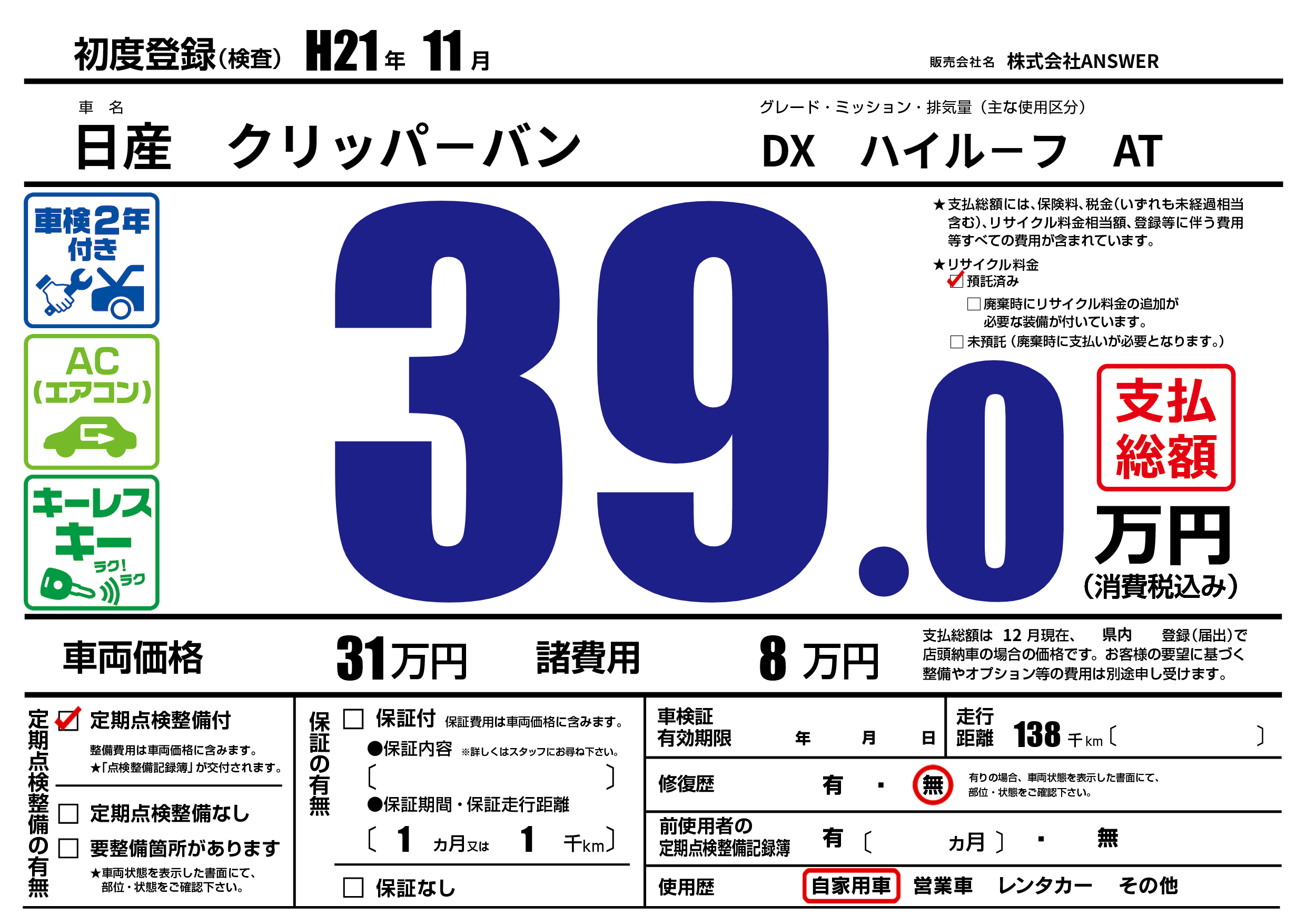 | 走行キロ | 13.8万km | 初年度登録 | H21年11月 |