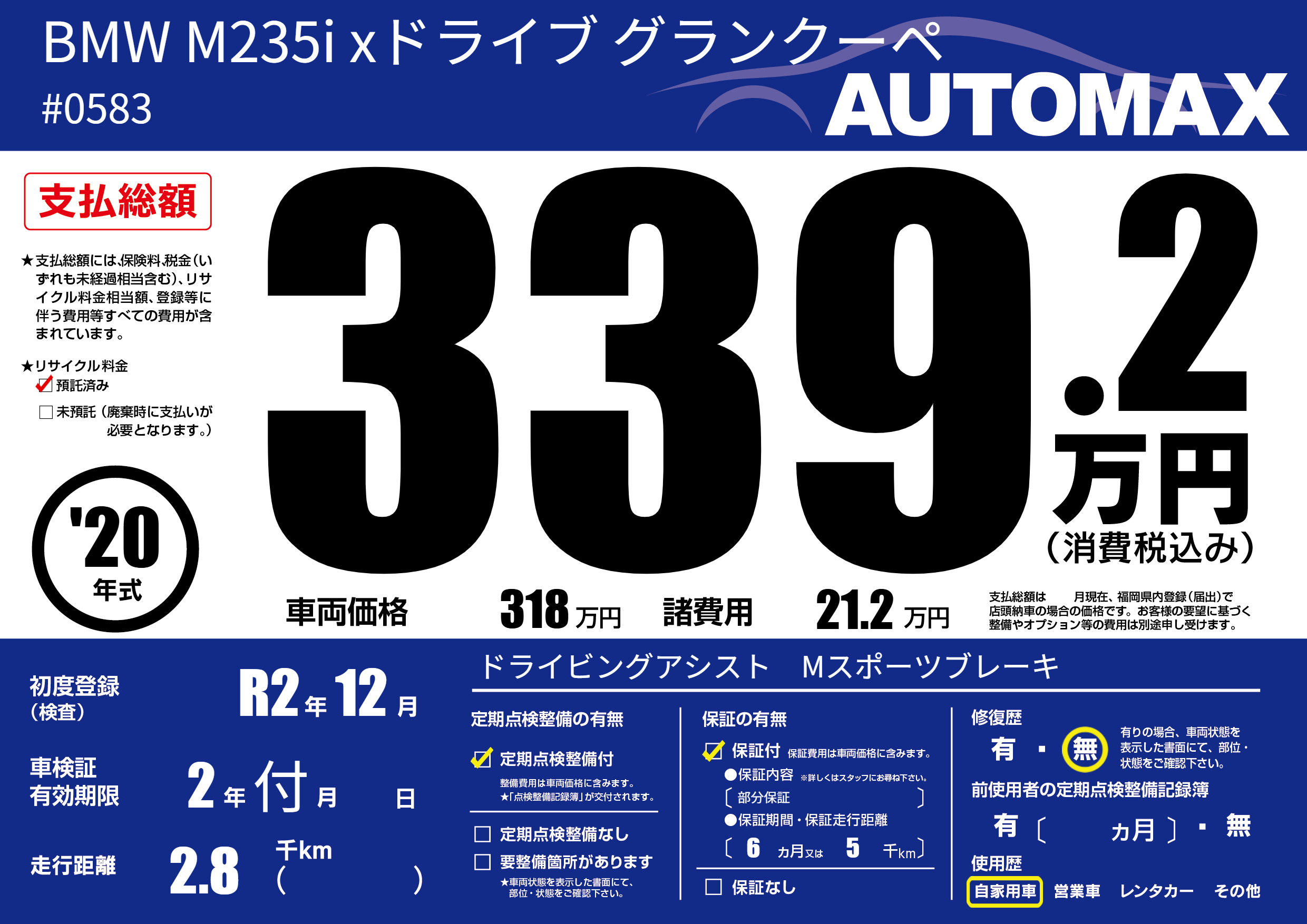 | 車名 | BMW M235i xドライブ グランクーペ | グレード ミッション 排気量 |