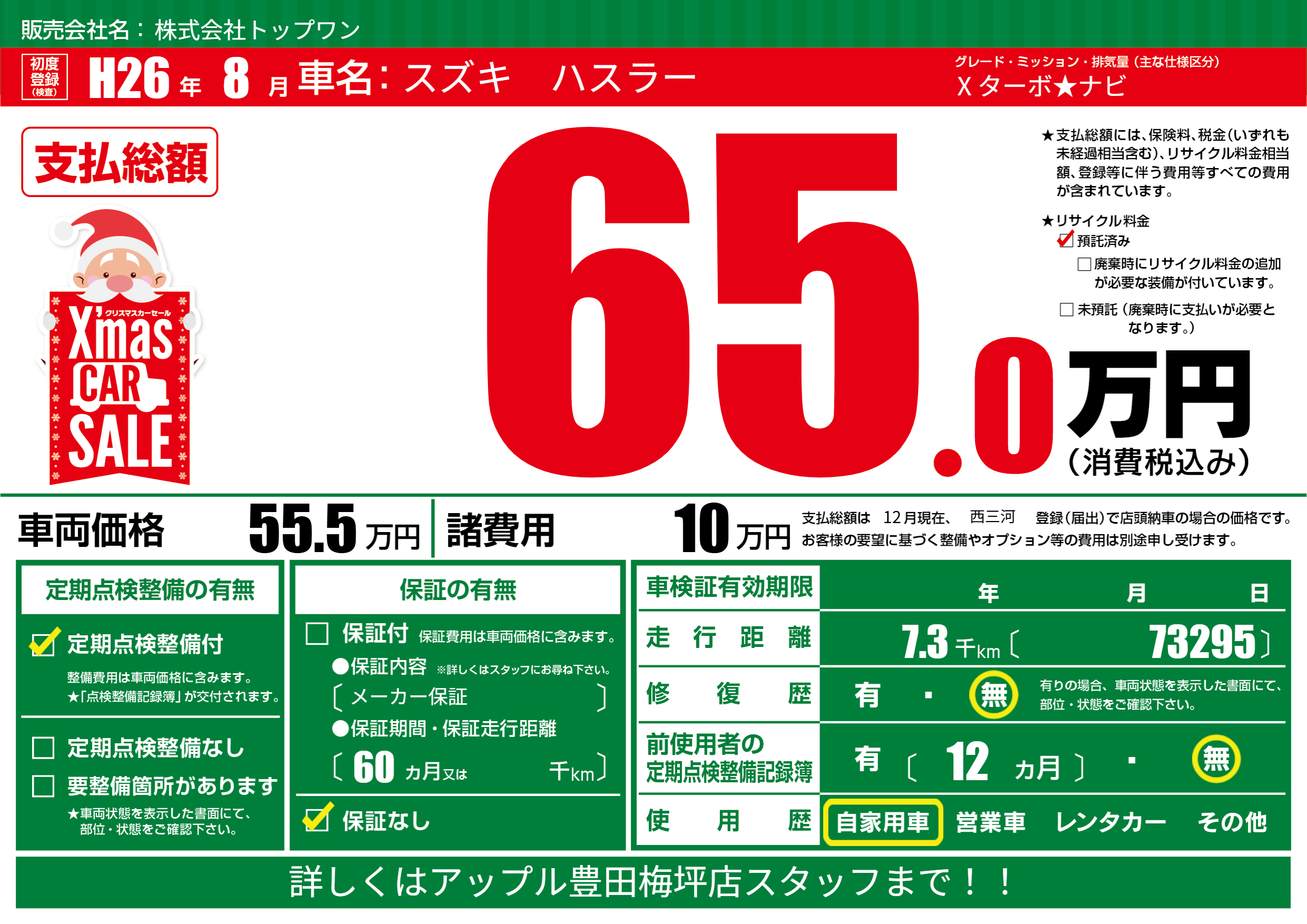 | 車名 | スズキ ハスラー | グレード ミッション 排気量 |