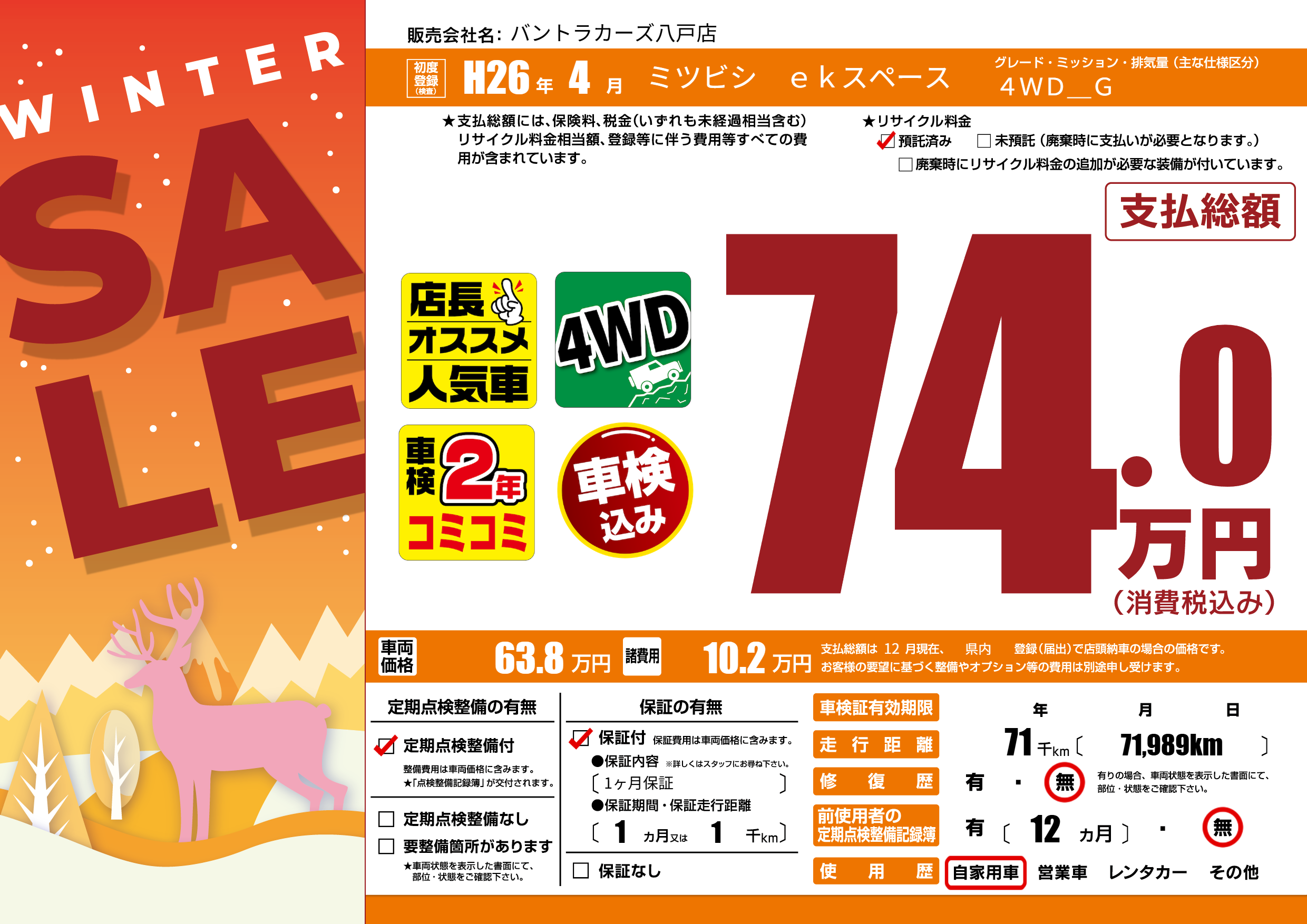 | 走行キロ | 7.1万km | 初年度登録 | H26年4月 |