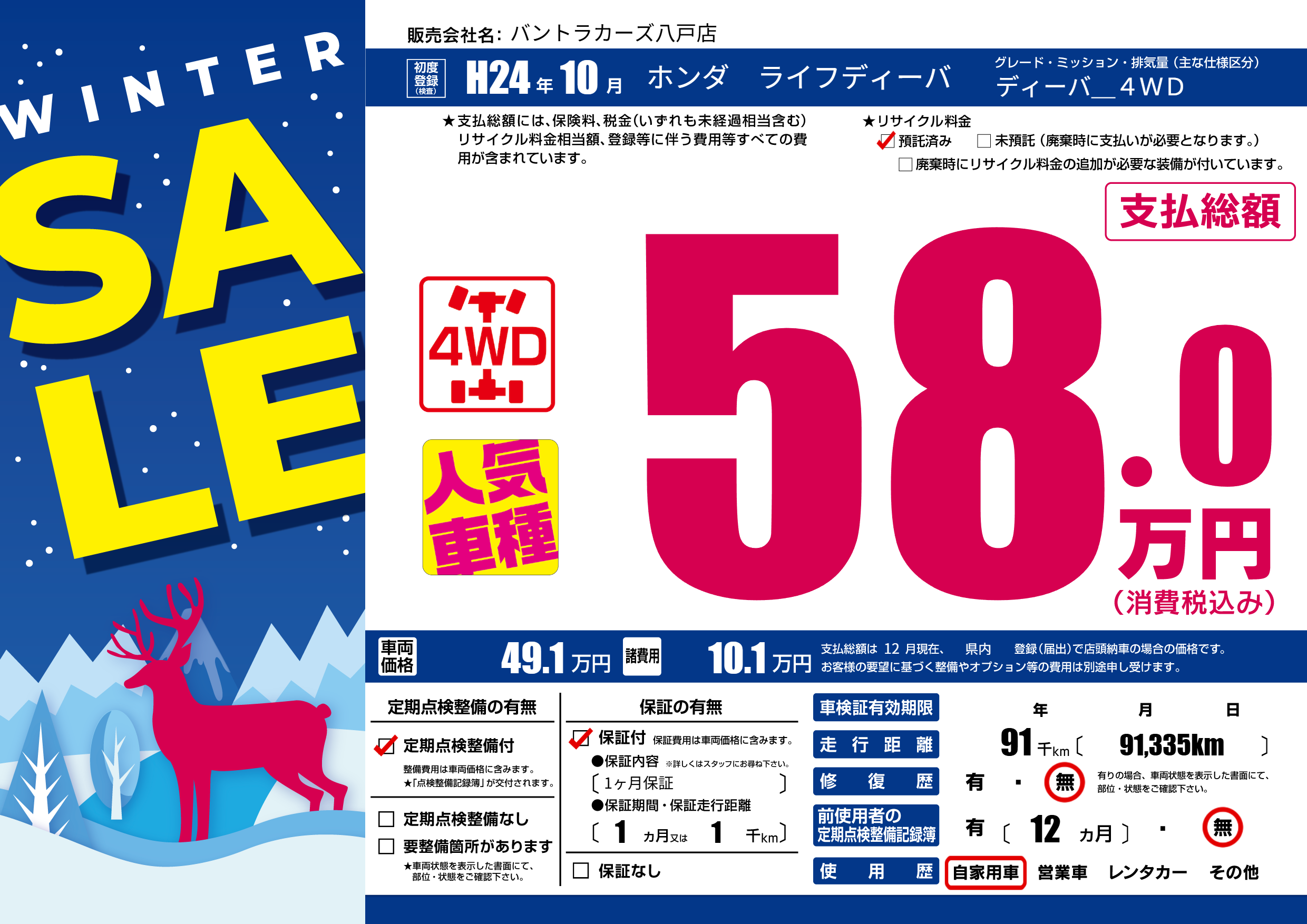 | 走行キロ | 9.1万km | 初年度登録 | H24年10月 |