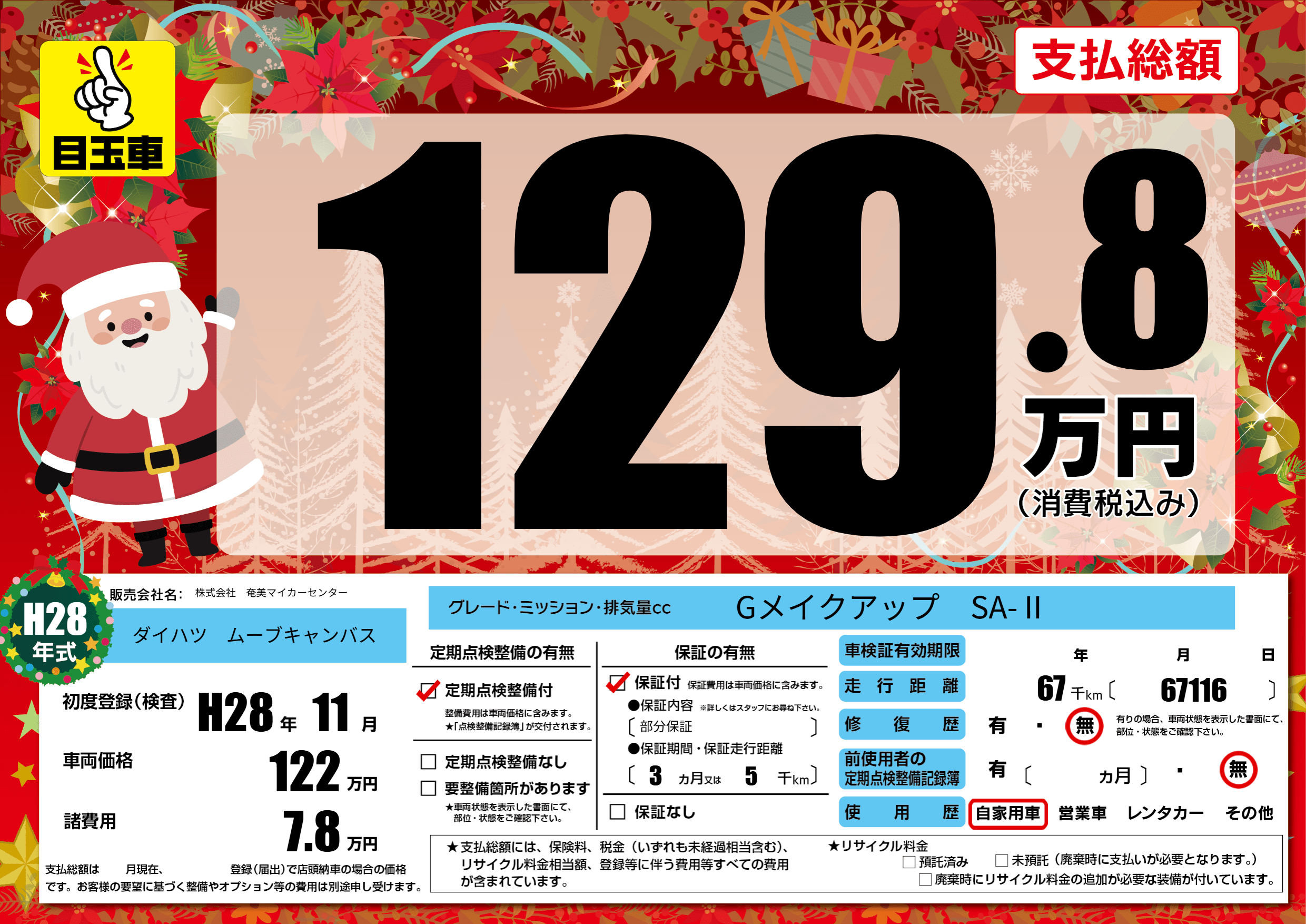 | 走行キロ | 6.7万km | 初年度登録 | H28年11月 |