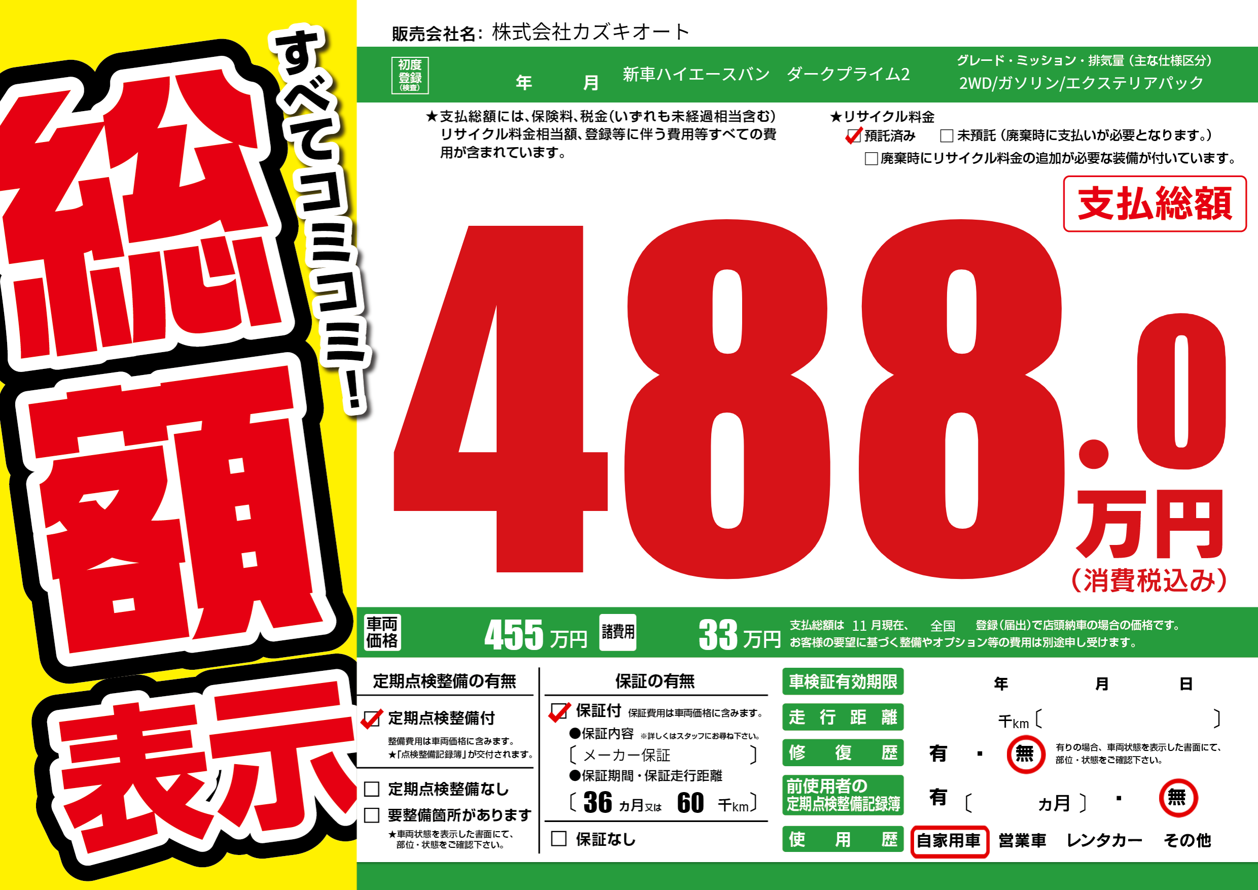 | 車名 | 新車ハイエースバン ダークプライム2 | グレード ミッション 排気量 |