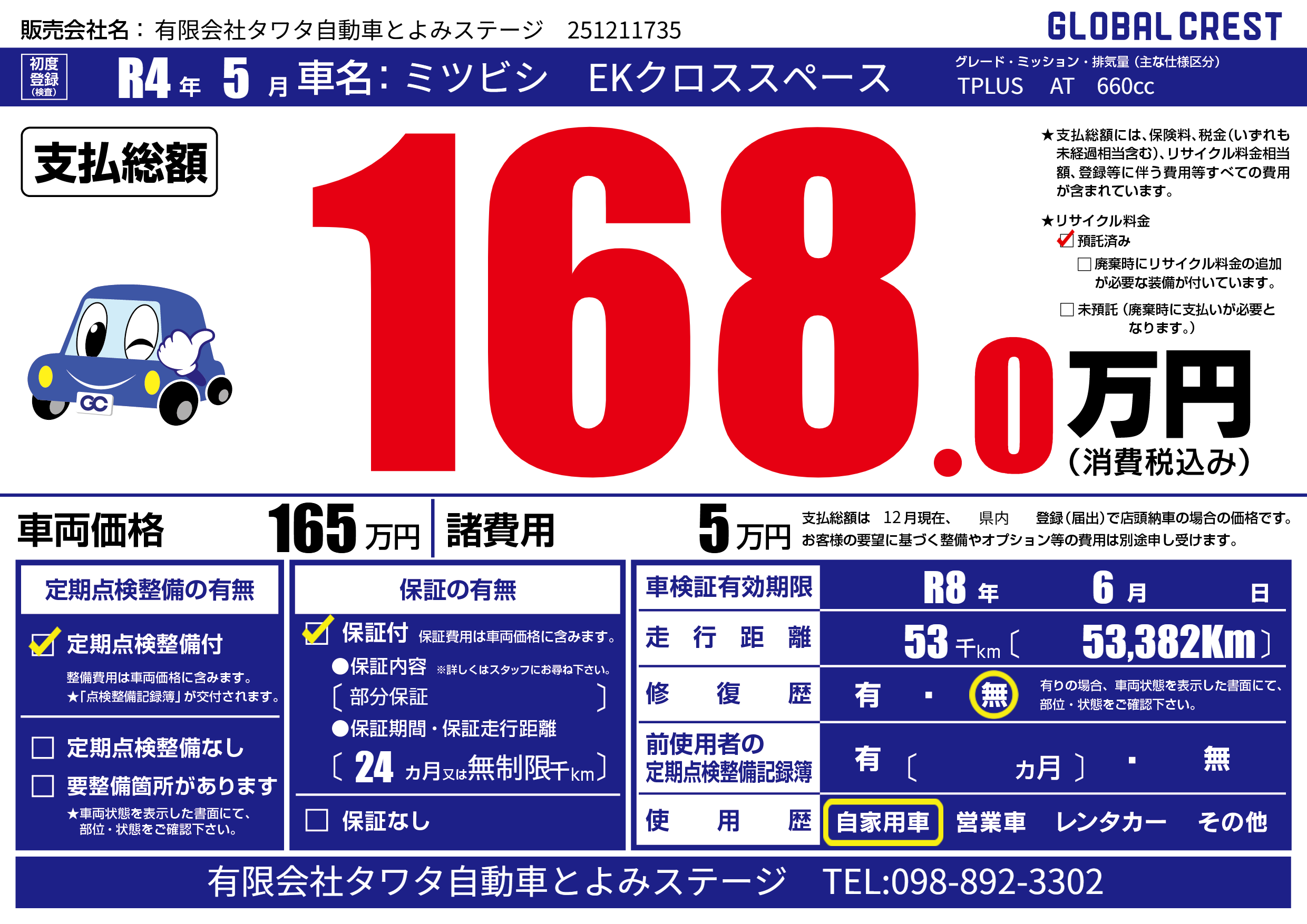 | 車名 | ミツビシ EKクロススペース | グレード ミッション 排気量 |