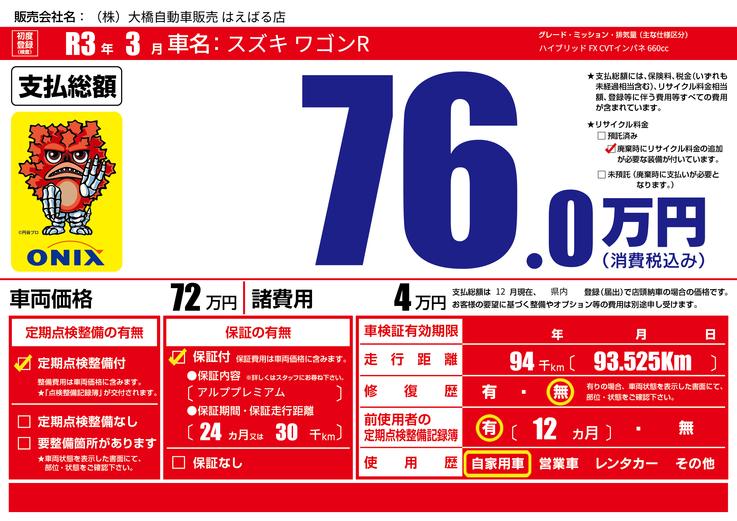 | 車名 | スズキ ワゴンR | グレード ミッション 排気量 |