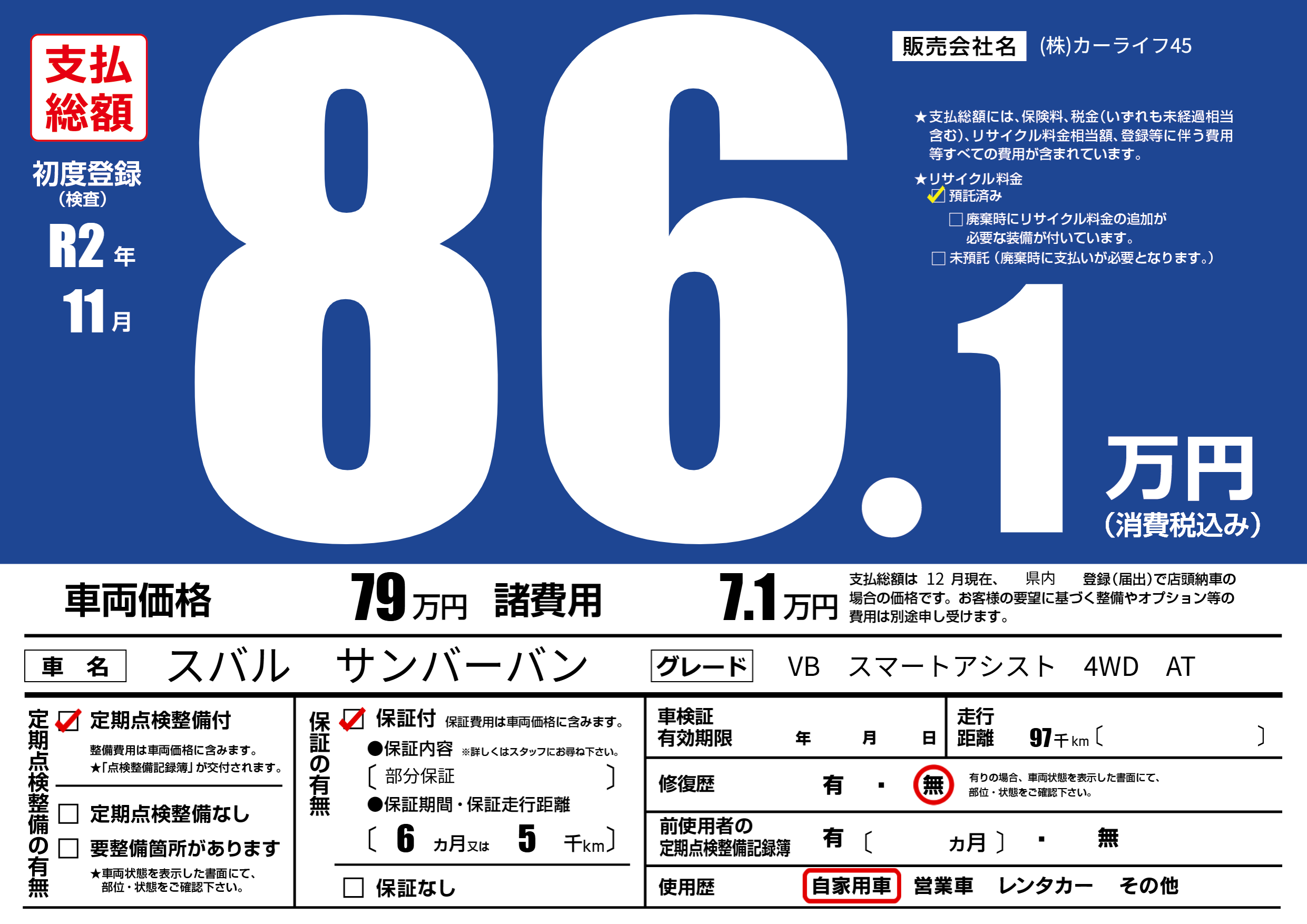 | 車名 | スバル サンバーバン | グレード ミッション 排気量 |