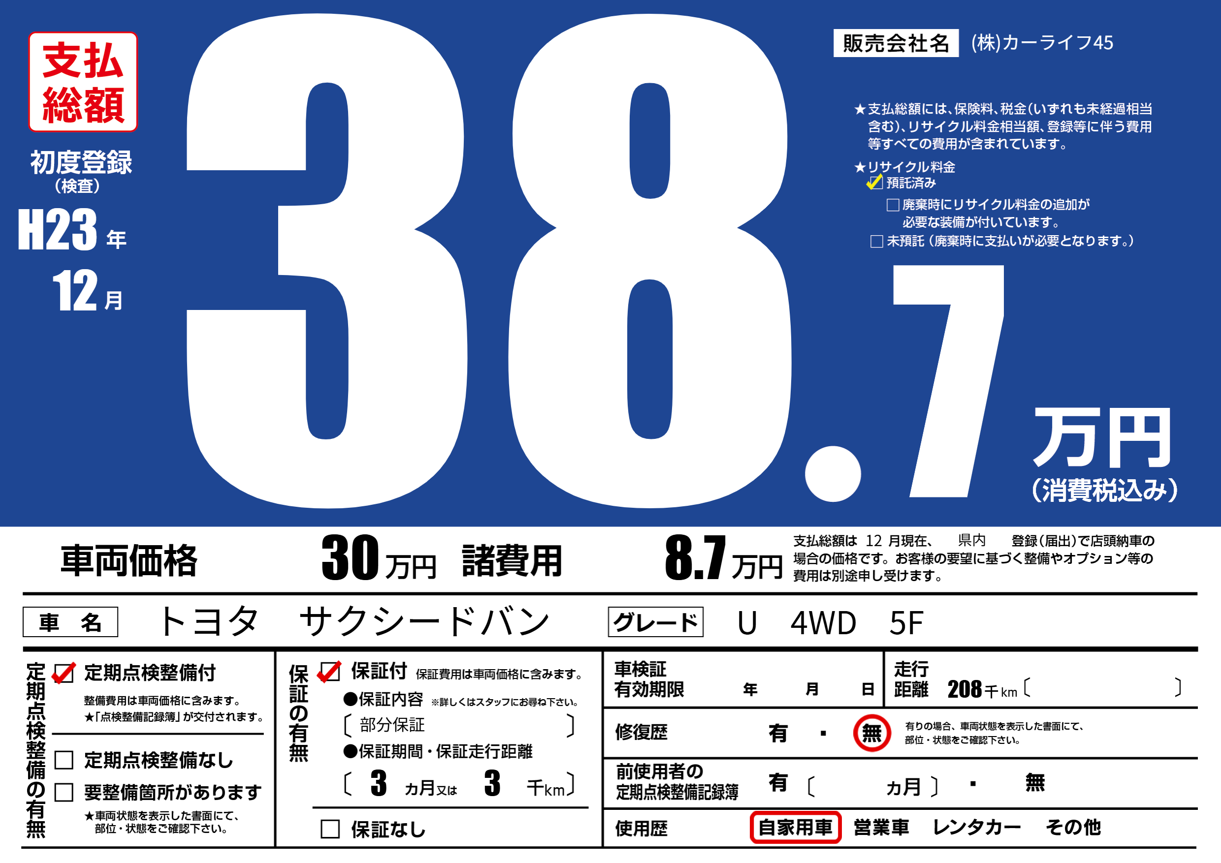 | 走行キロ | 20.8万km | 初年度登録 | H23年12月 |