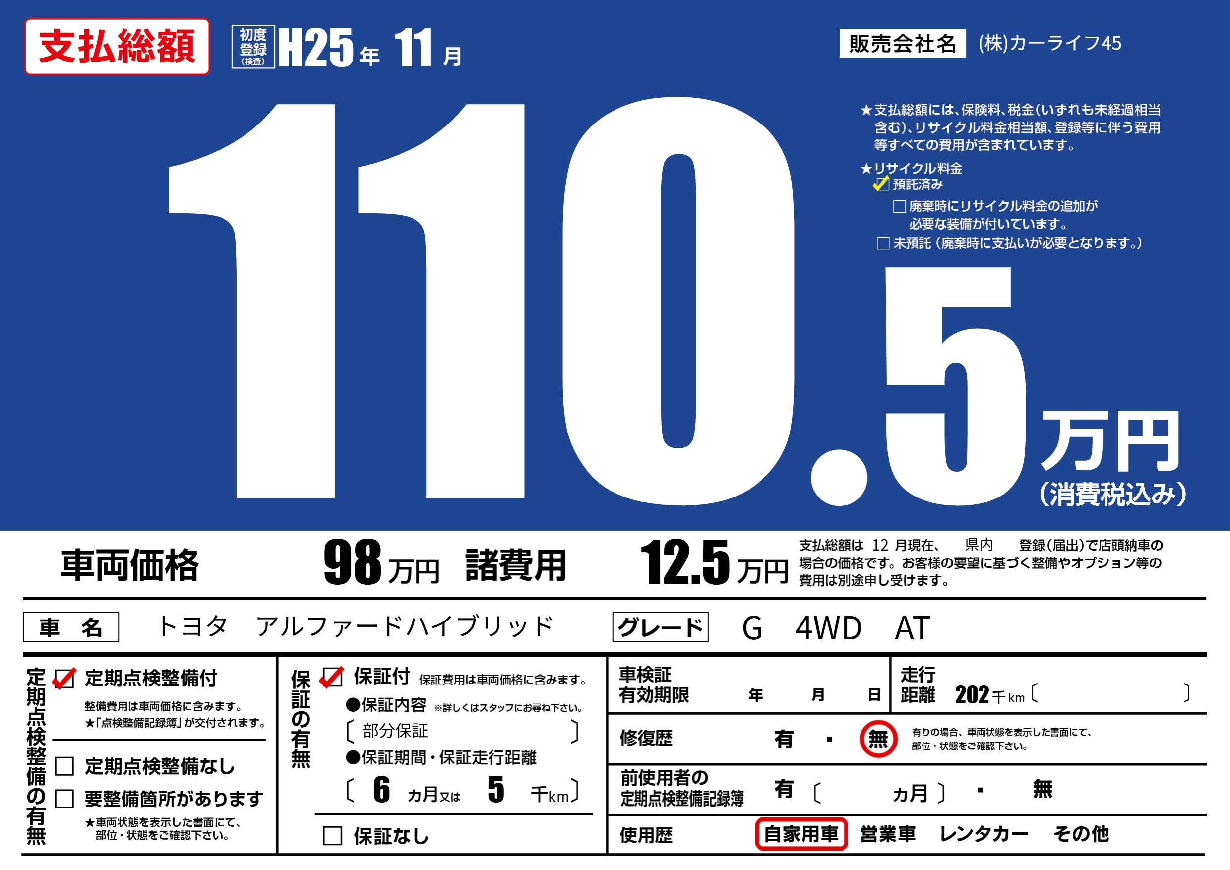 | 車名 | トヨタ アルファードハイブリッド | グレード ミッション 排気量 |
