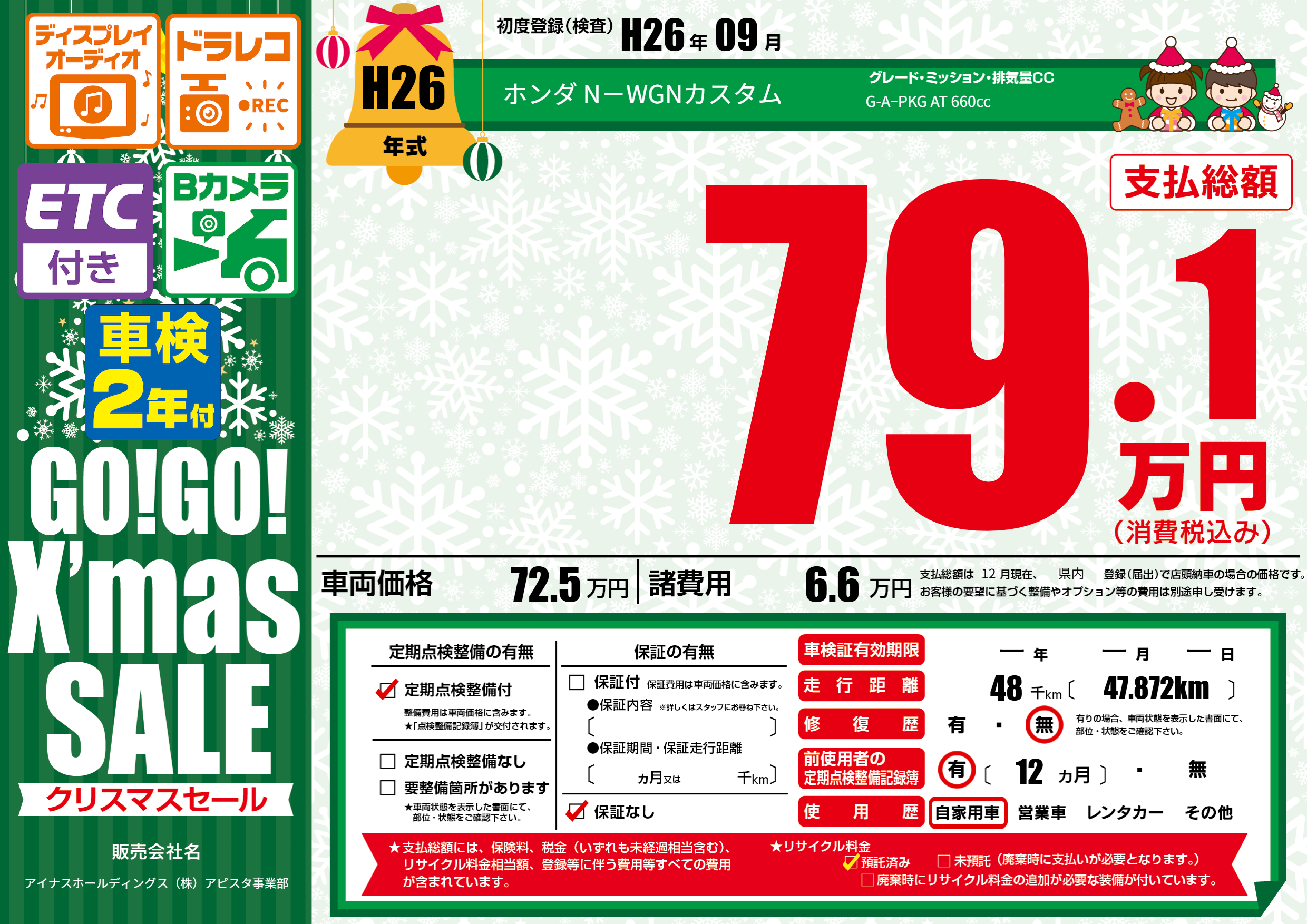 | 走行キロ | 4.8万km | 初年度登録 | H26年09月 |
