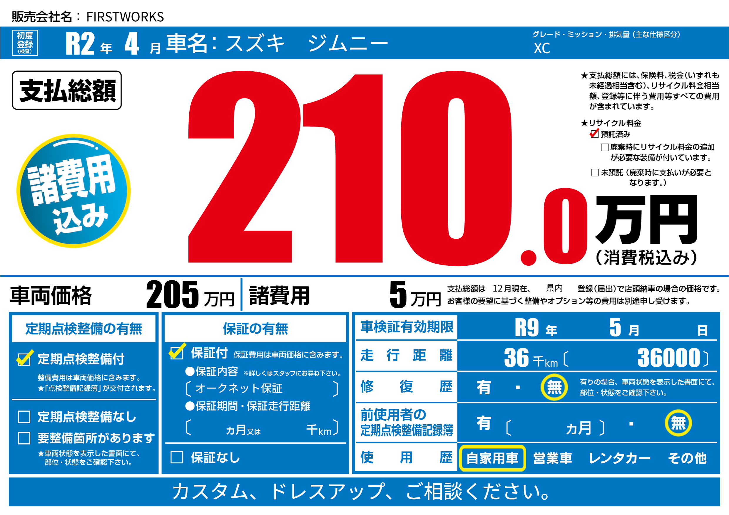 | 車名 | スズキ ジムニー | グレード ミッション 排気量 |