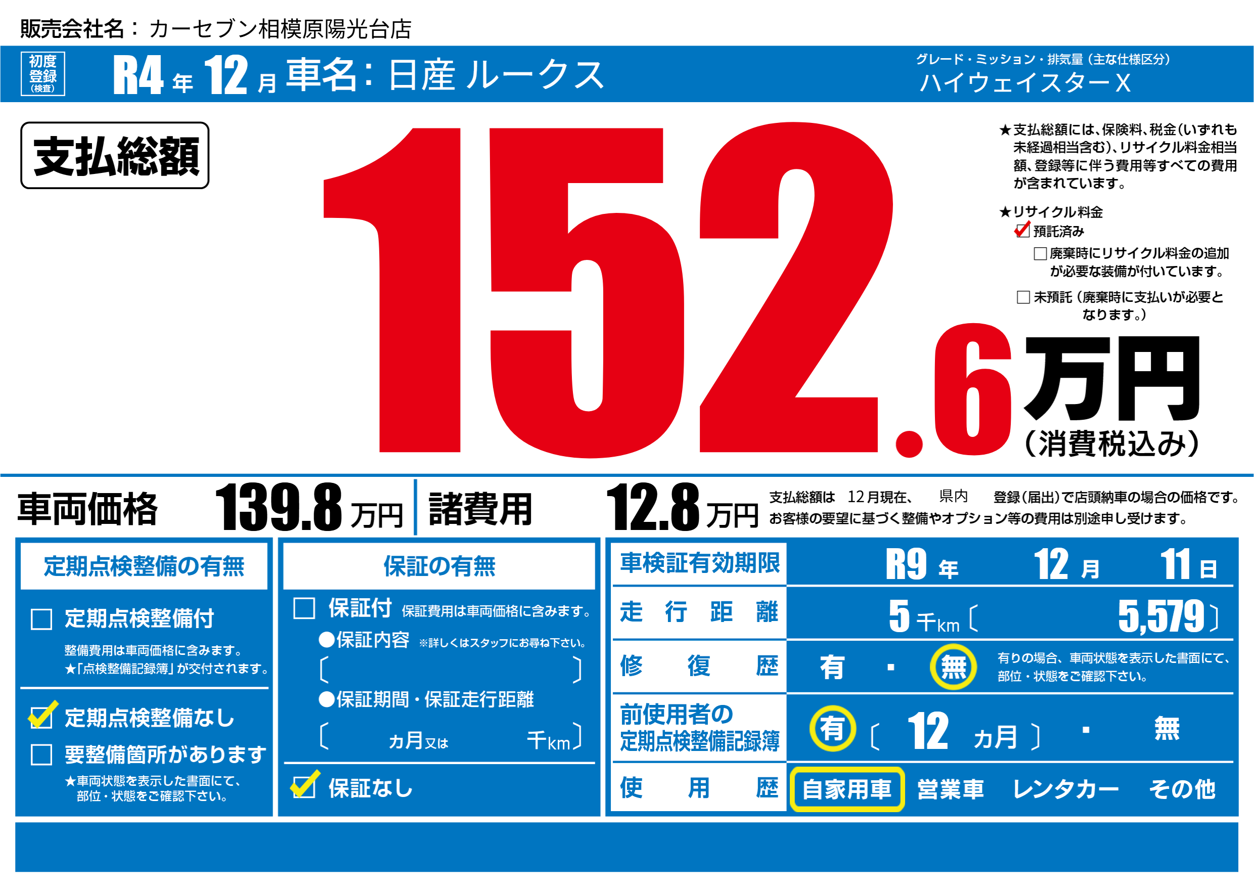 | 走行キロ | 0.5万km | 初年度登録 | R4年12月 |