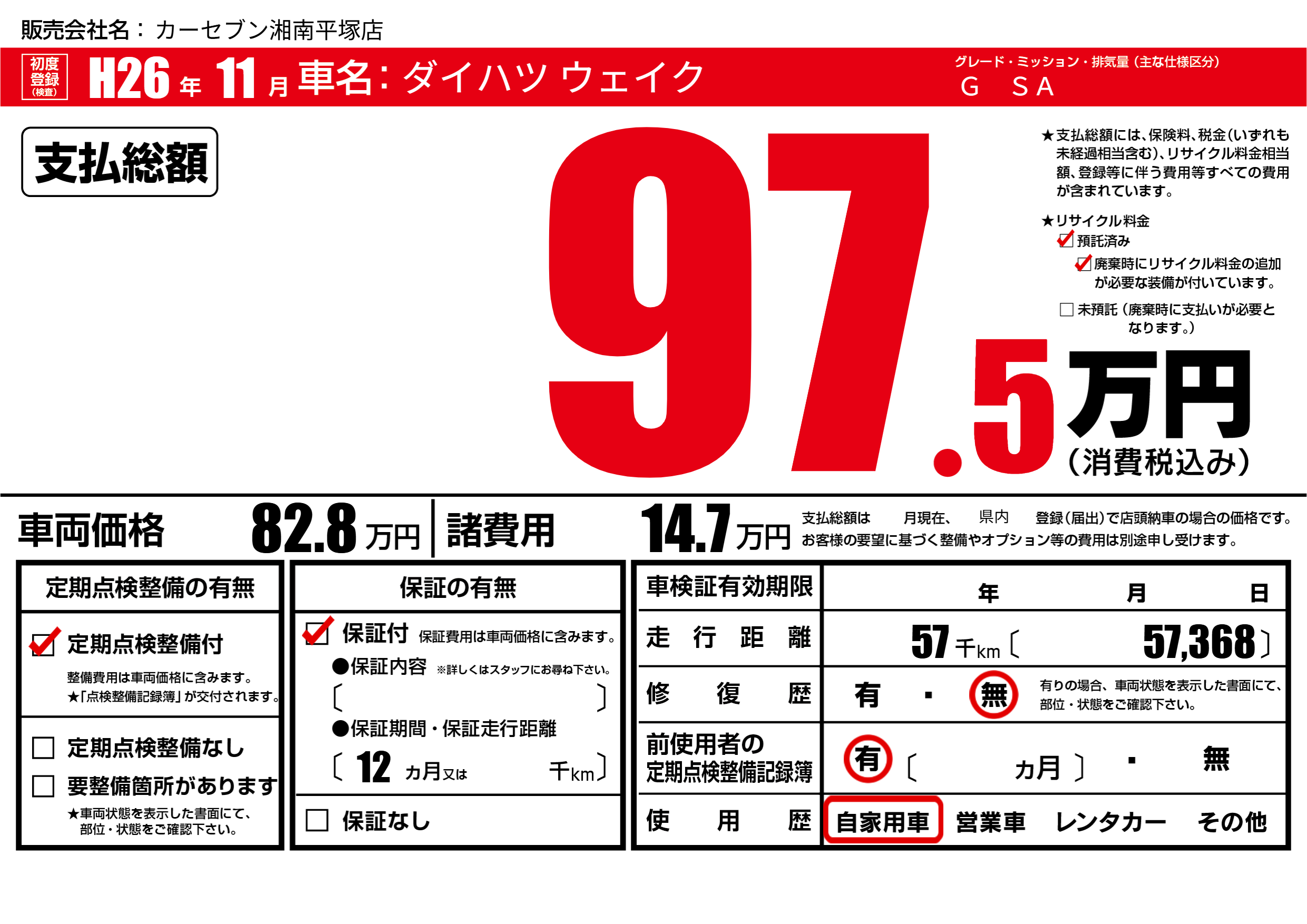 | 走行キロ | 5.7万km | 初年度登録 | H26年11月 |