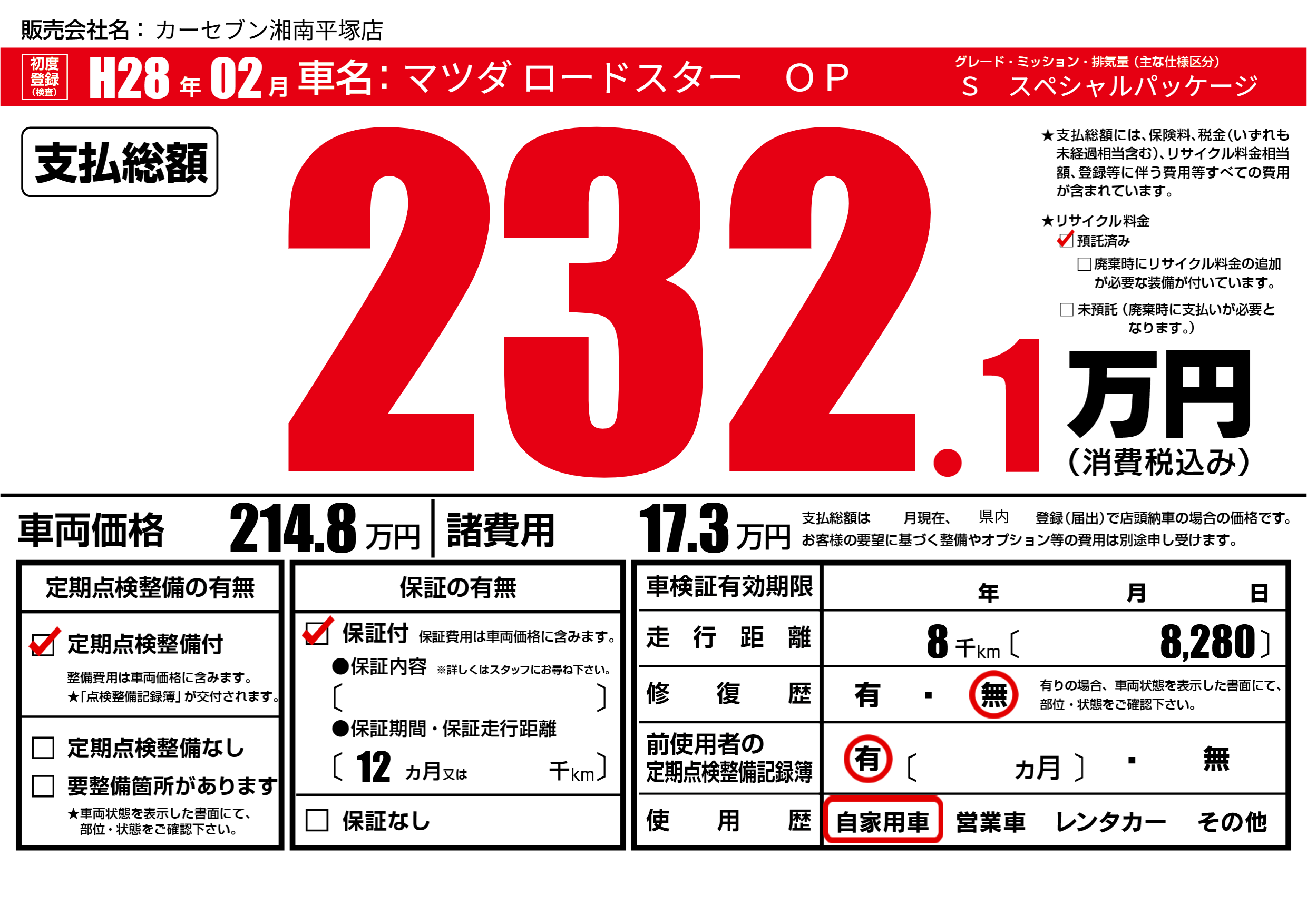 | 走行キロ | 0.8万km | ||