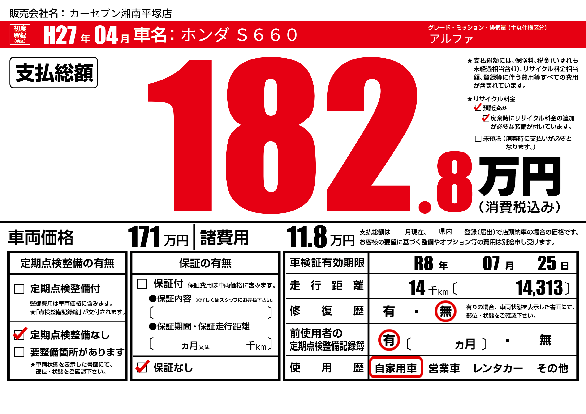 | 走行キロ | 1.4万km | 初年度登録 | H27年04月 |
