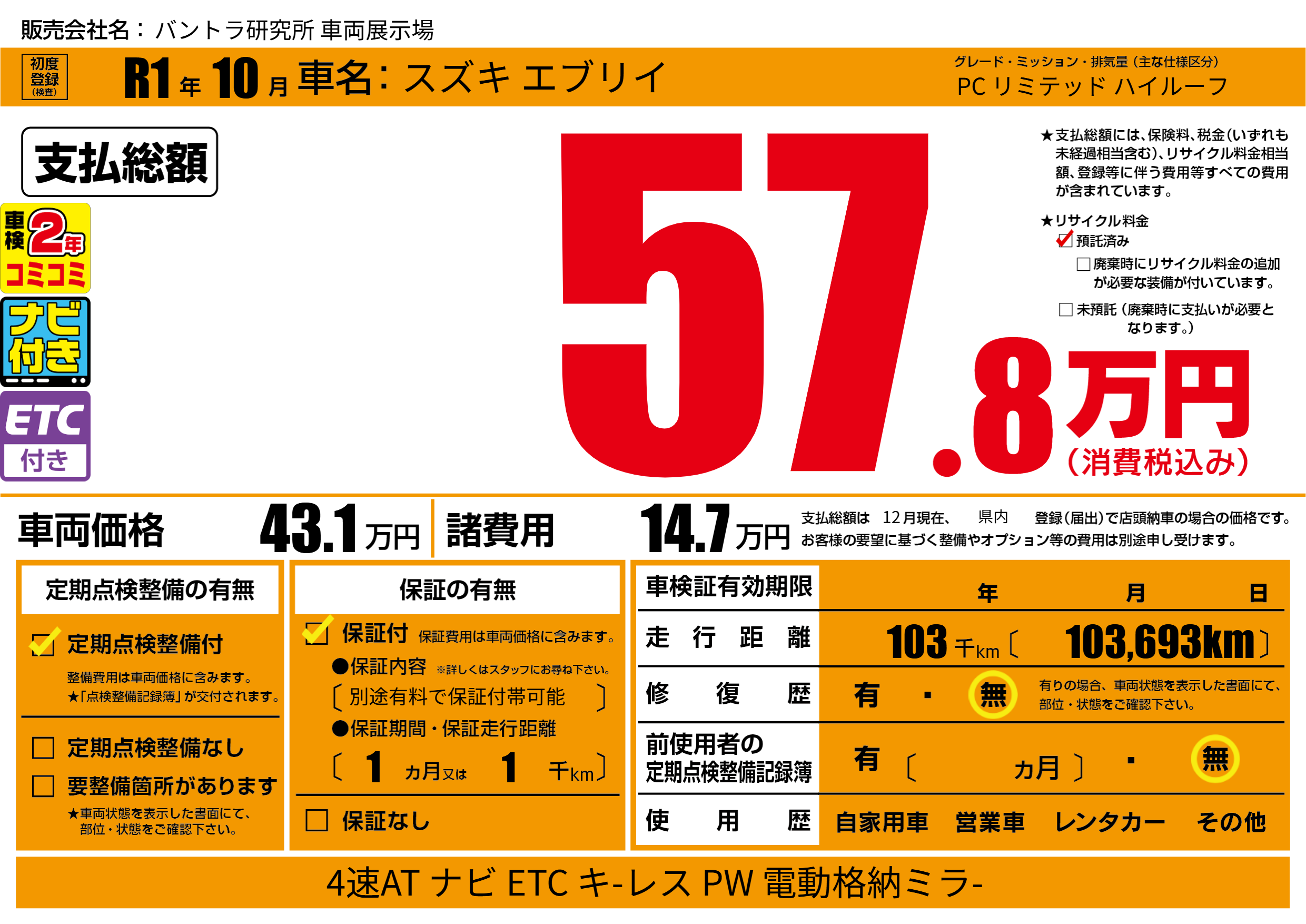 | 車名 | スズキ エブリイ | グレード ミッション 排気量 |