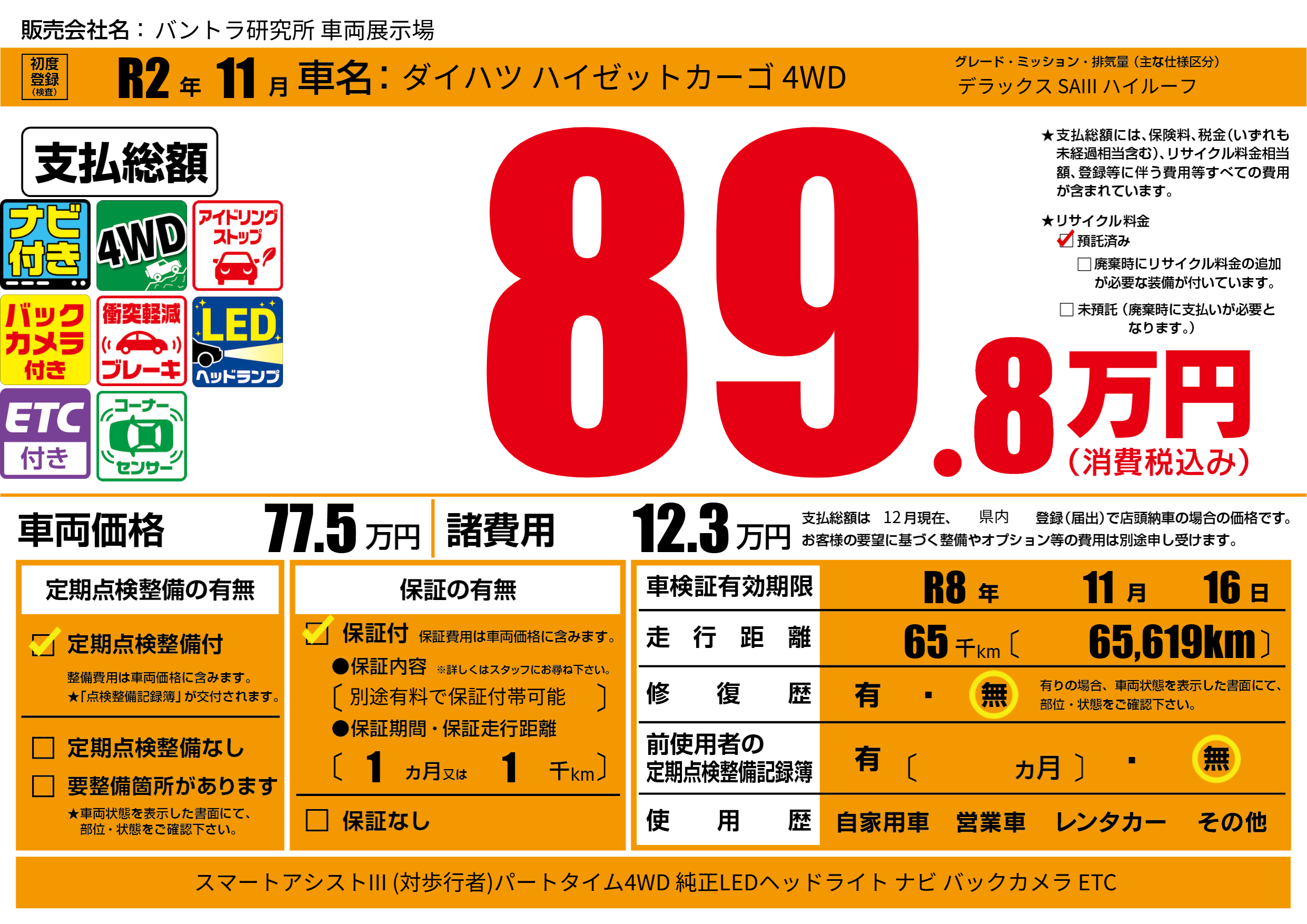 | 車名 | ダイハツ ハイゼットカーゴ 4WD | グレード ミッション 排気量 |