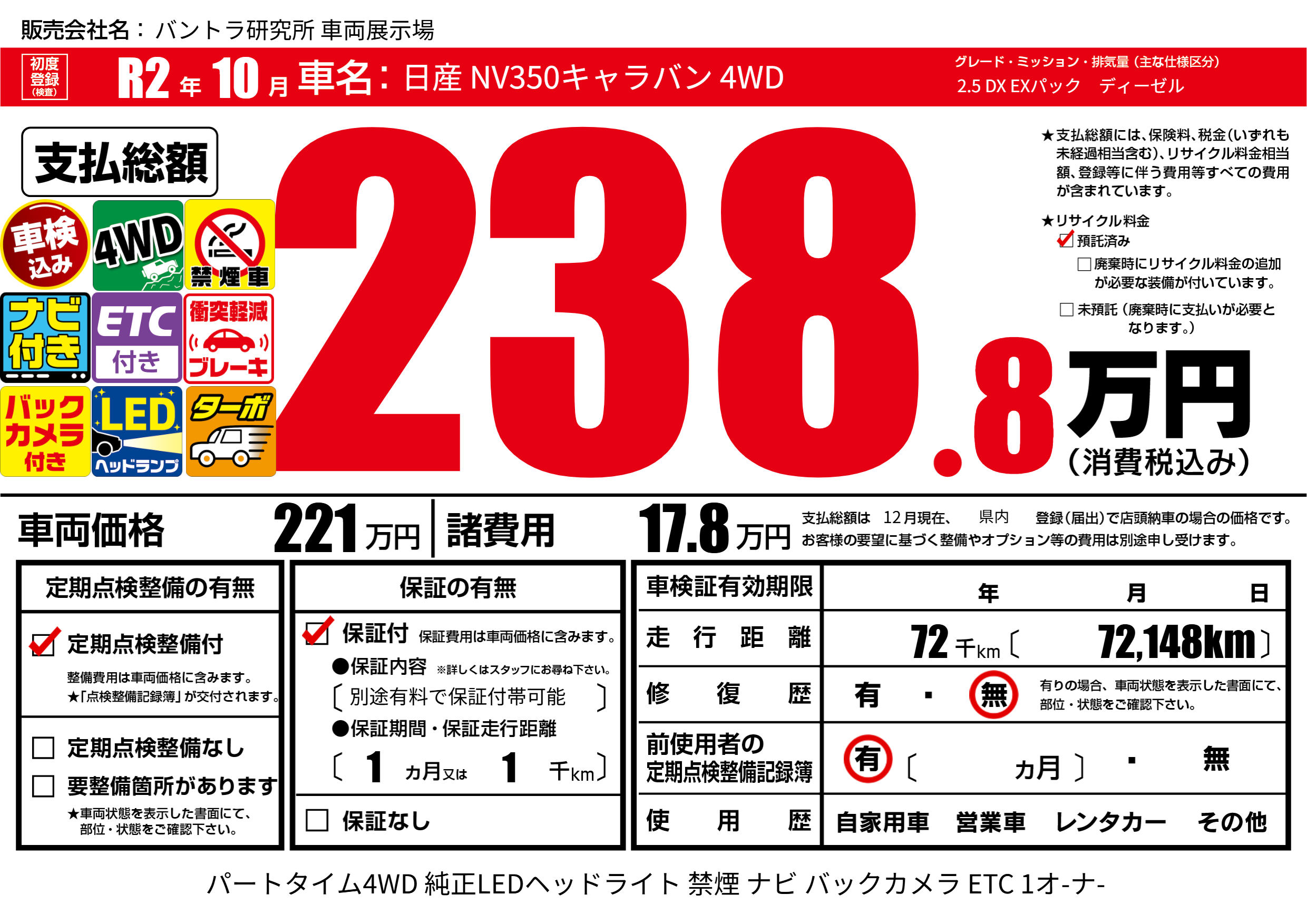 | 車名 | 日産 NV350キャラバン 4WD | グレード ミッション 排気量 |