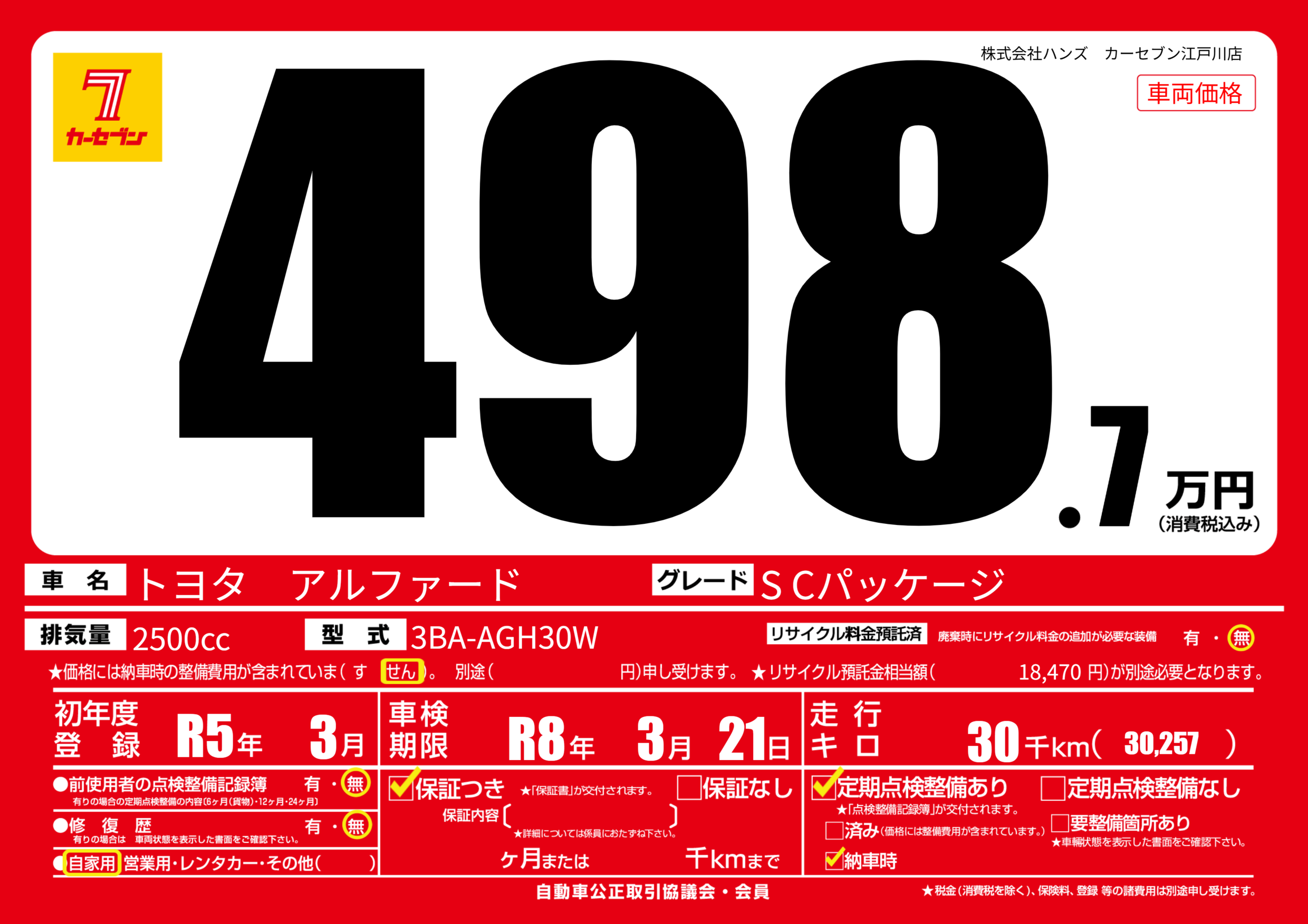 | 走行キロ | 3万km | 初年度登録 | R5年3月 |