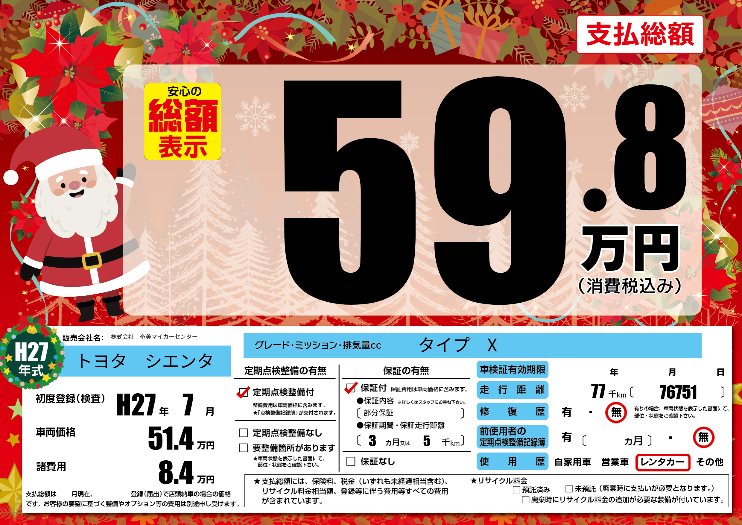 | 車名 | トヨタ シエンタ | グレード ミッション 排気量 |