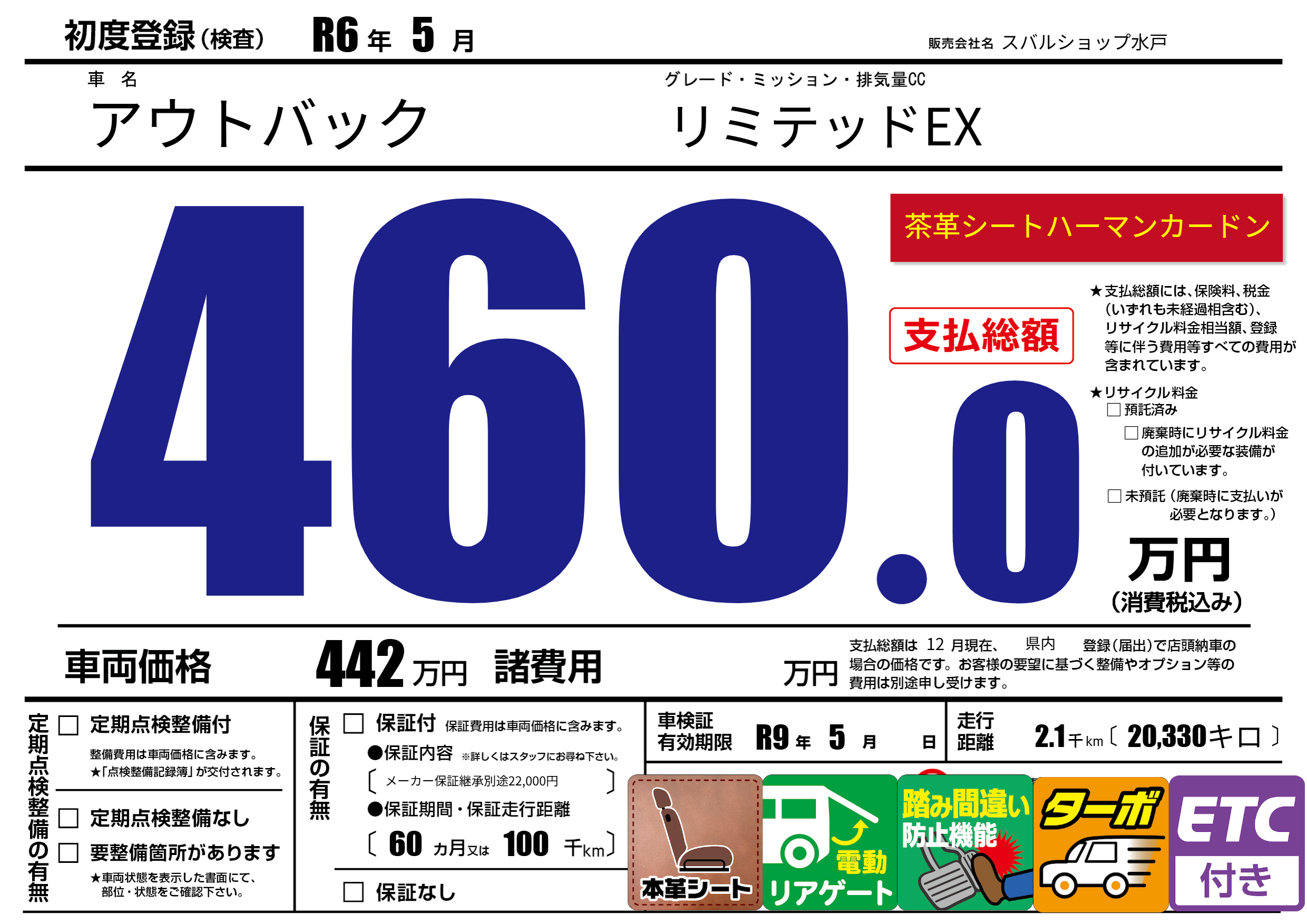 | 車名 | アウトバック | グレード ミッション 排気量 |