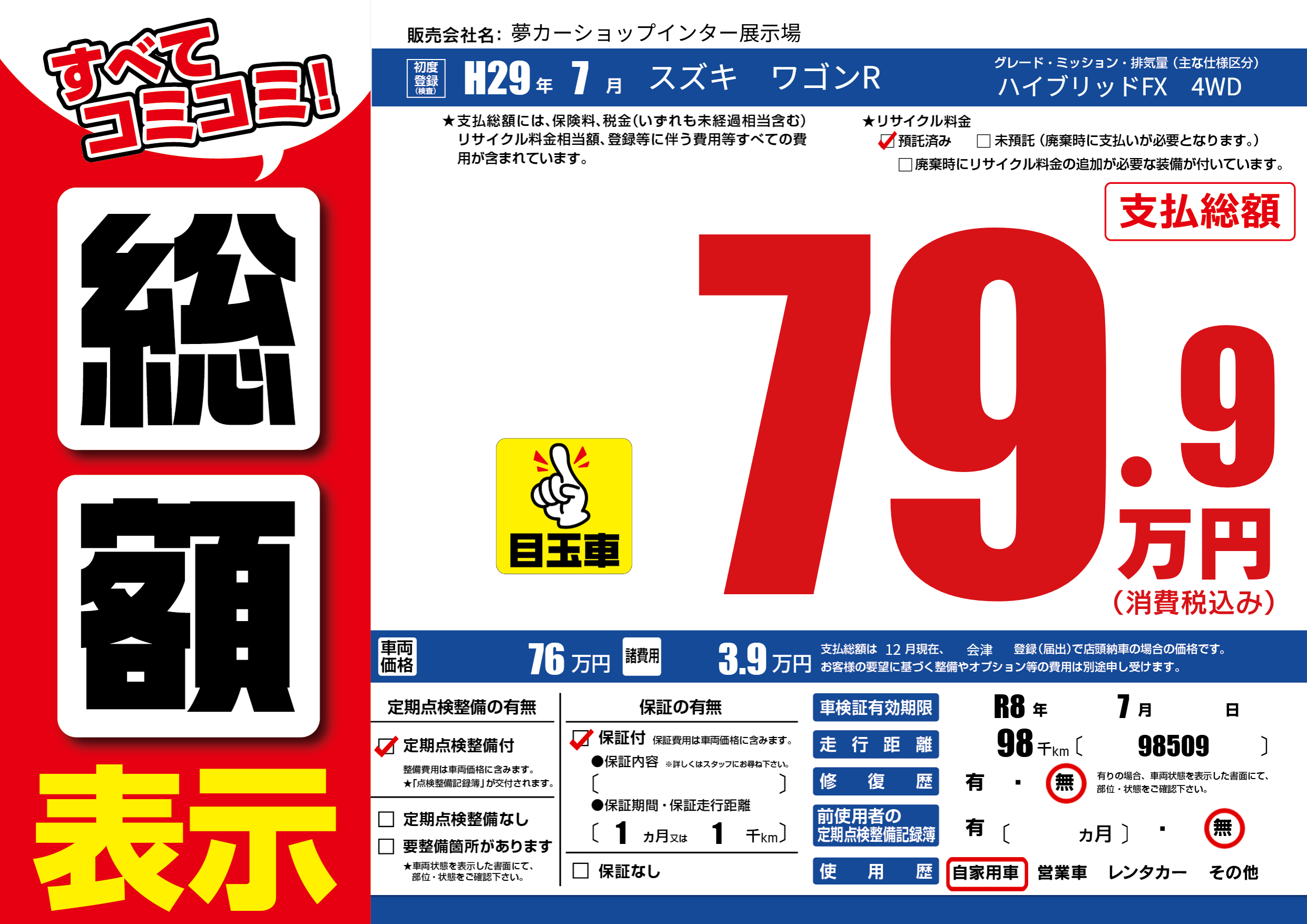| 車名 | スズキ ワゴンR | グレード ミッション 排気量 |