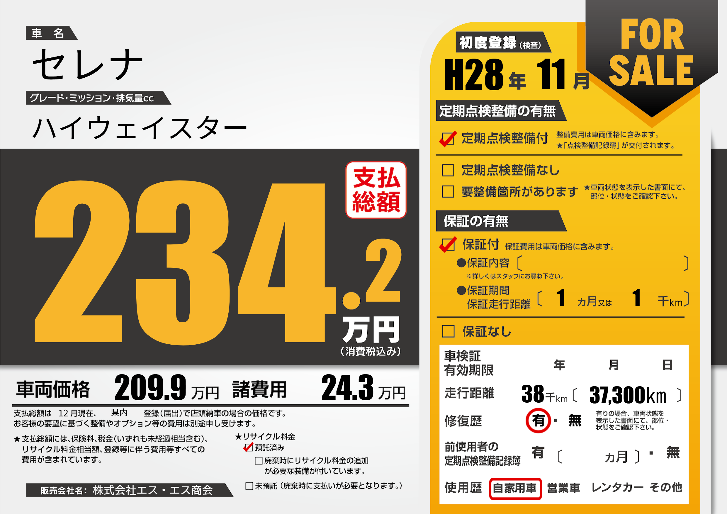 | 走行キロ | 3.8万km | 初年度登録 | H28年11月 |