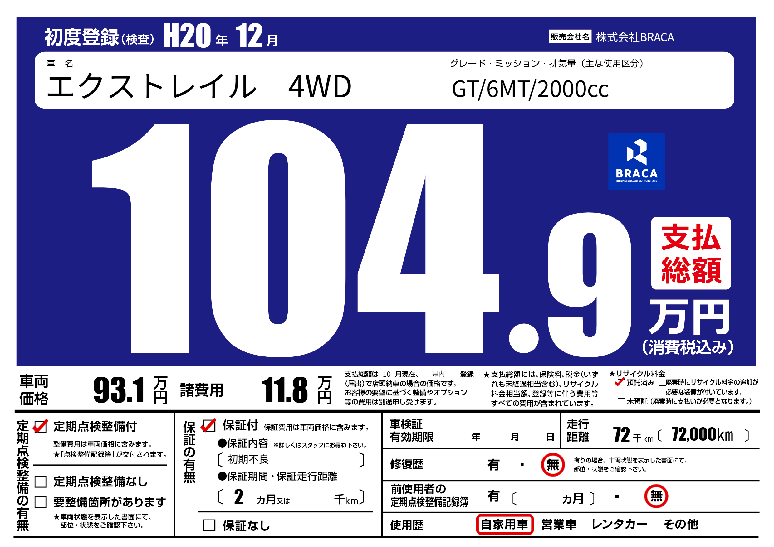 | 車名 | エクストレイル 4WD | グレード ミッション 排気量 |