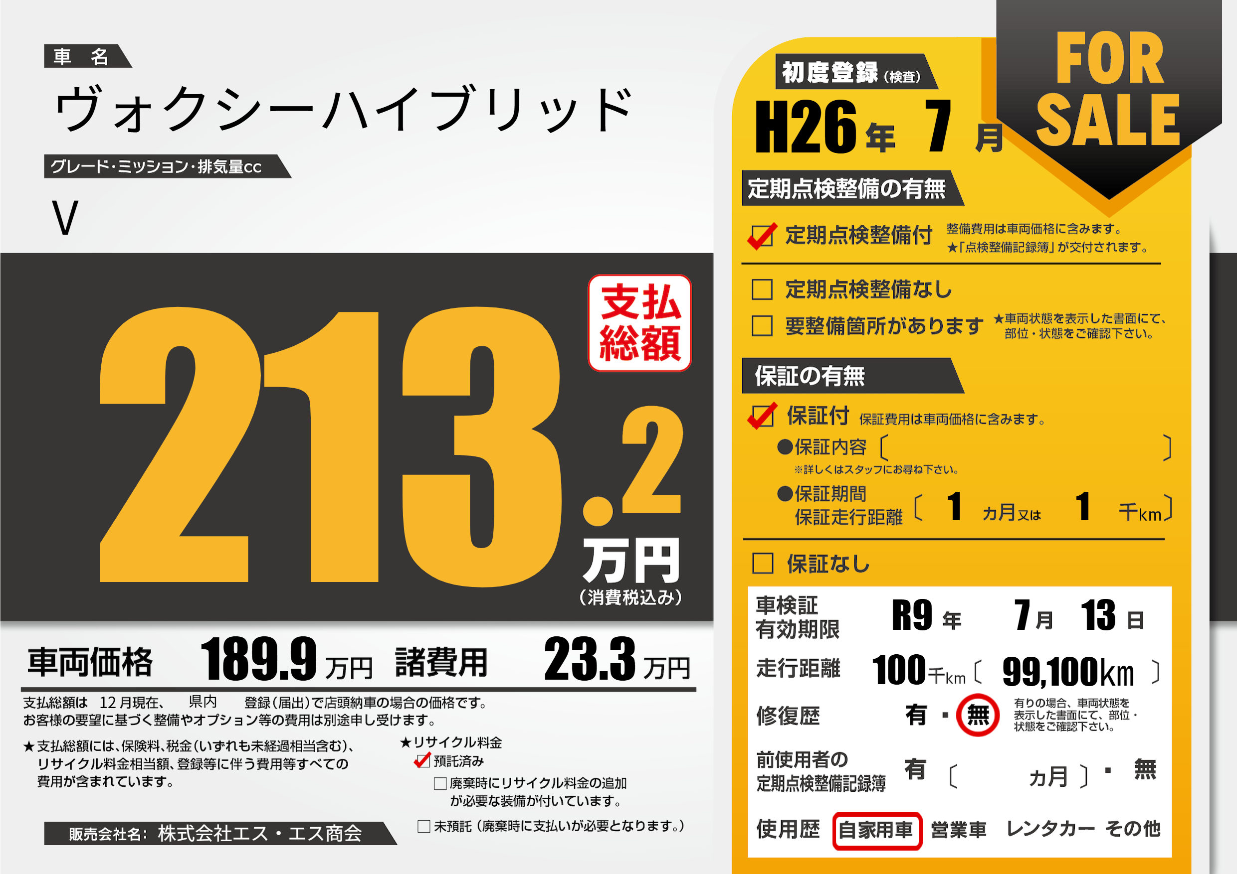 | 走行キロ | 10万km | 初年度登録 | H26年7月 |