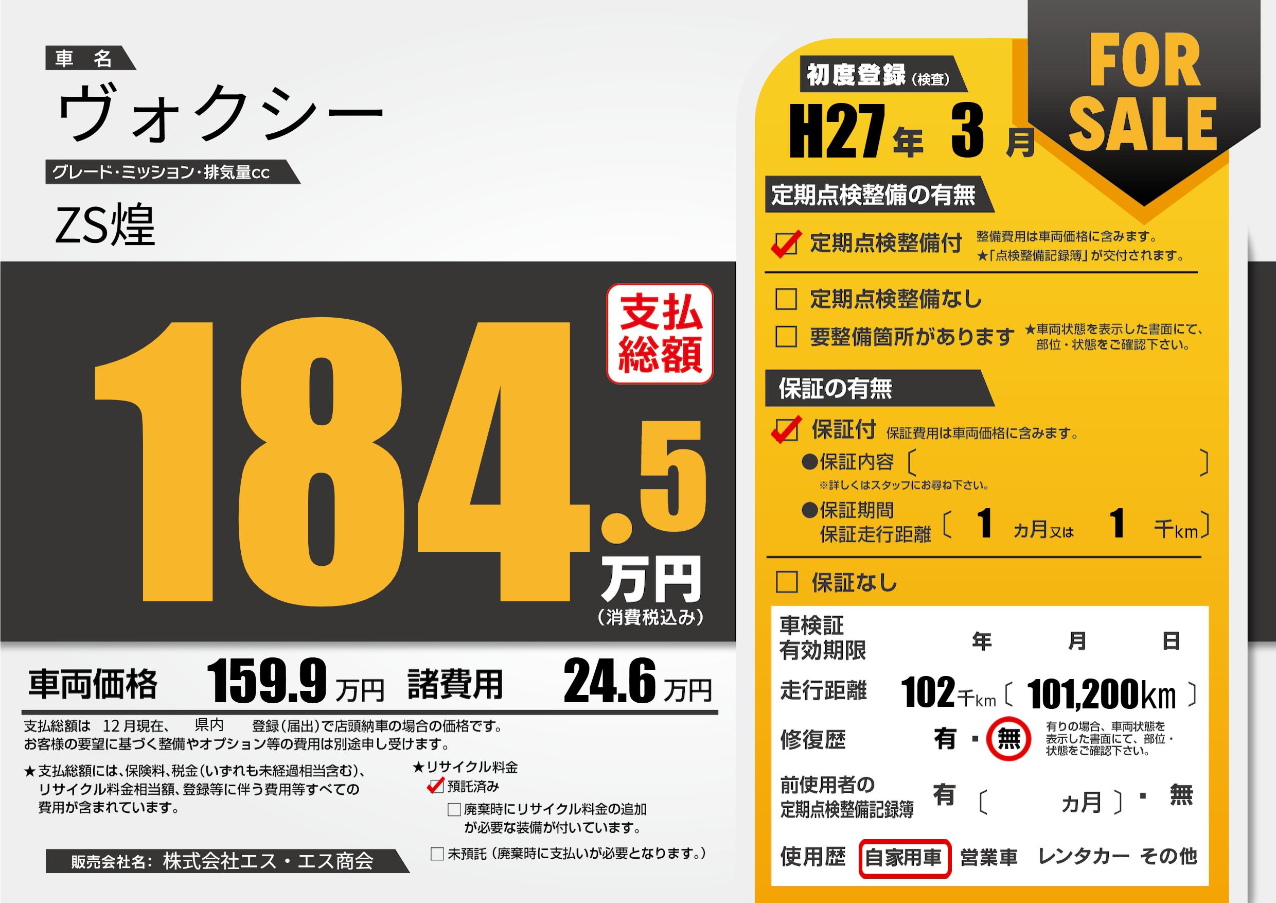| 走行キロ | 10.2万km | 初年度登録 | H27年3月 |