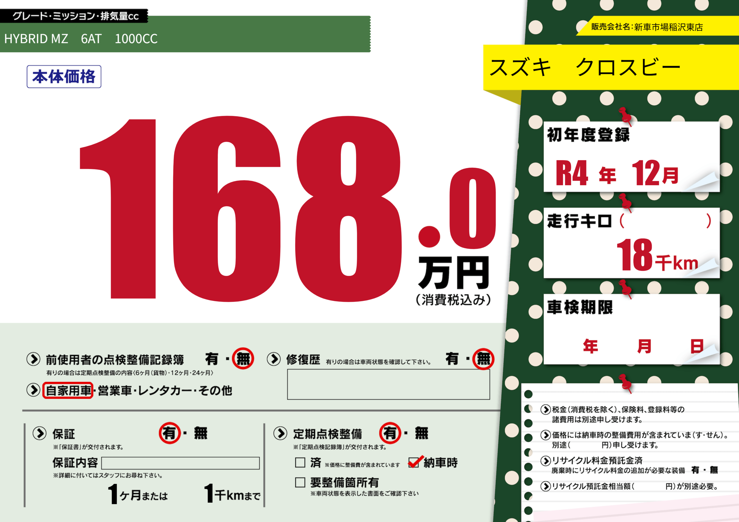 | 定期点検整備 | 定期点検整備あり 納車時あり | ||