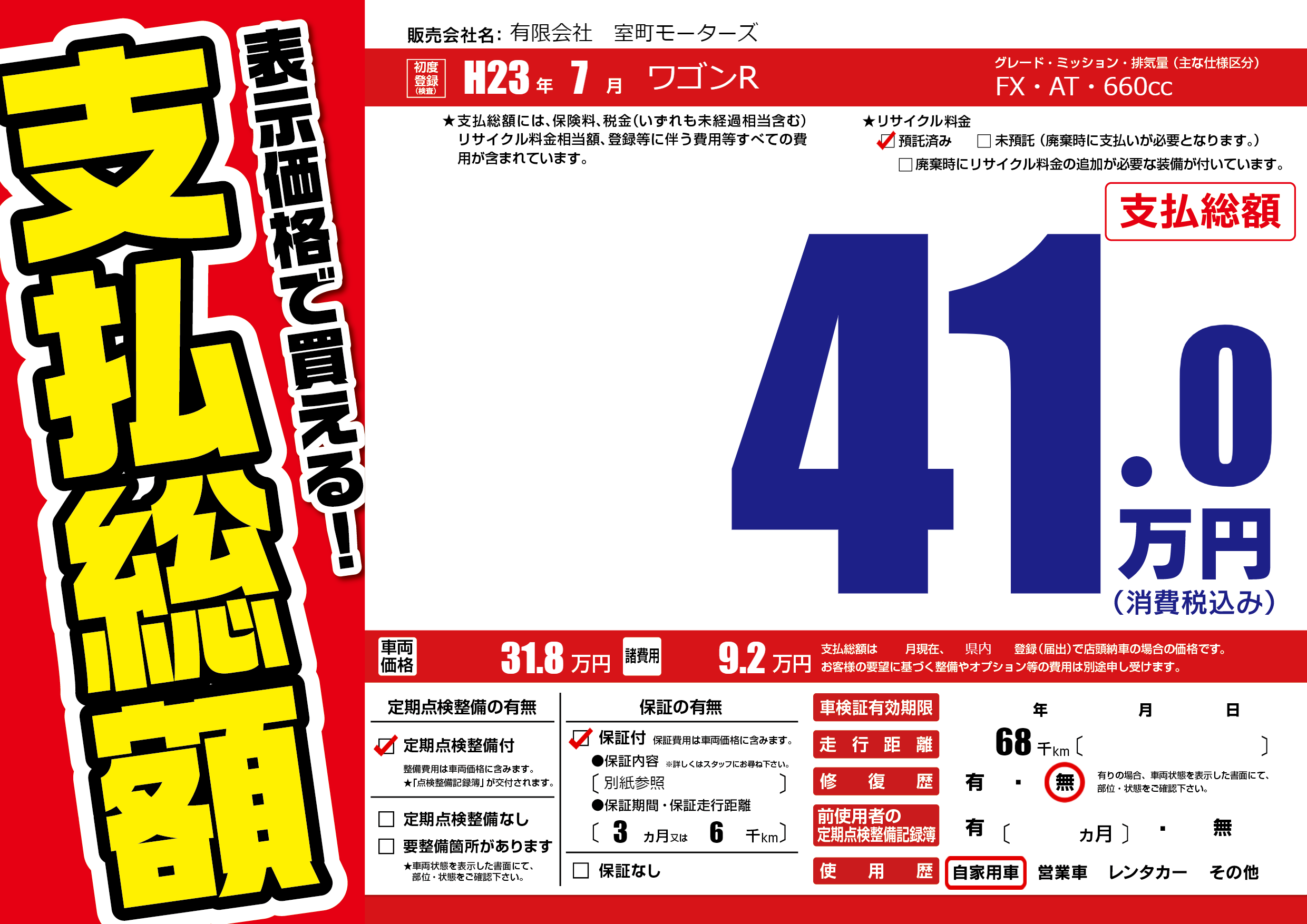 保証付き 保証内容(別紙参照) 3ヶ月または(6)千kmまで |