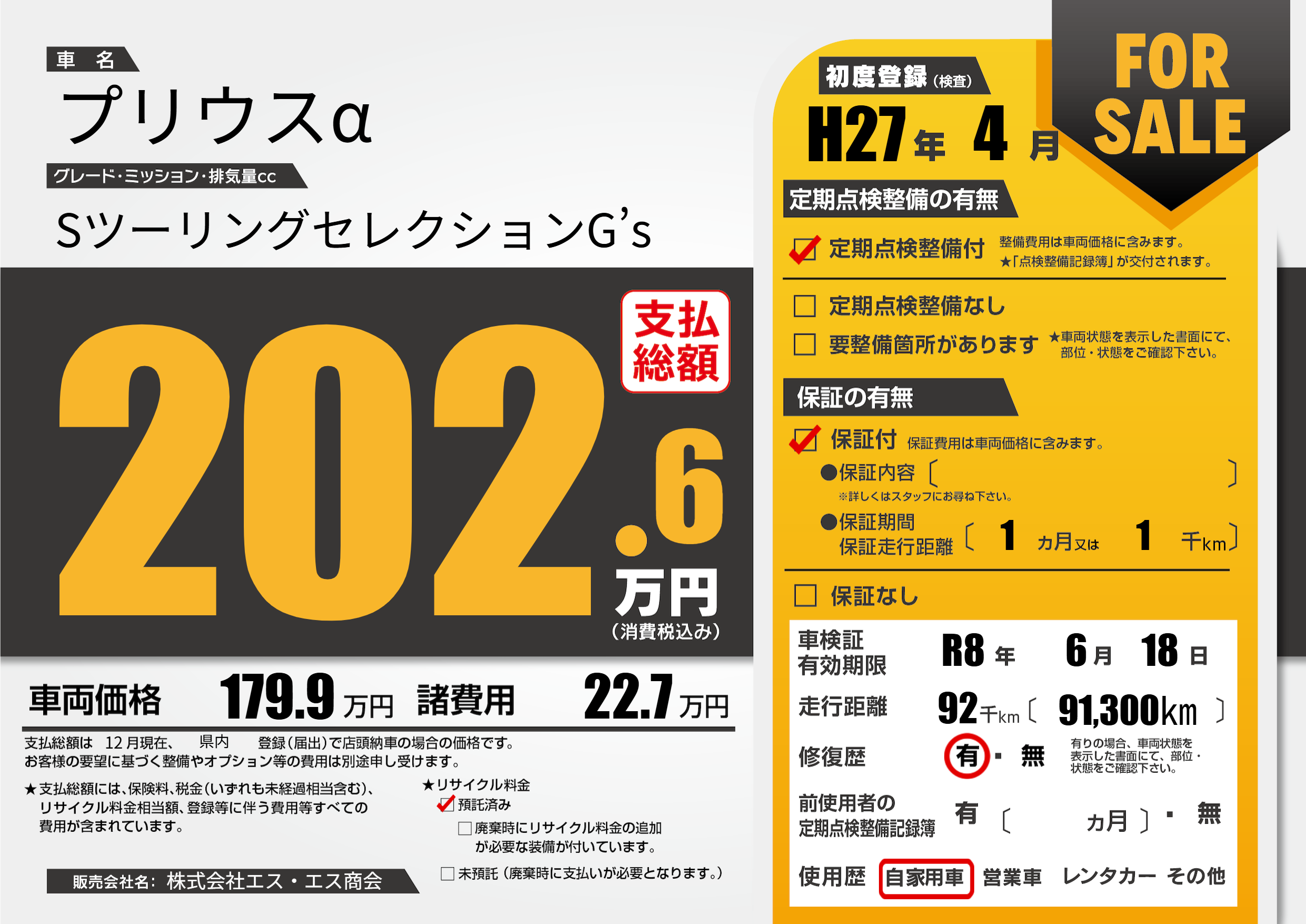 | 走行キロ | 9.2万km | 初年度登録 | H27年4月 |