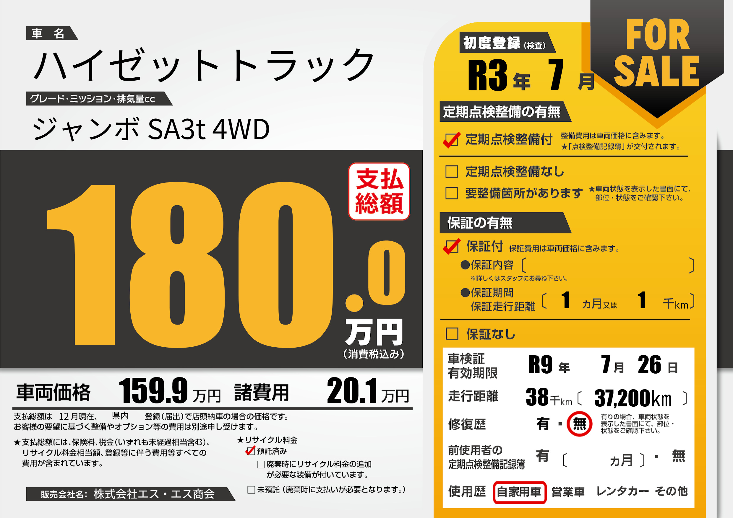 | 走行キロ | 3.8万km | 初年度登録 | R3年7月 |