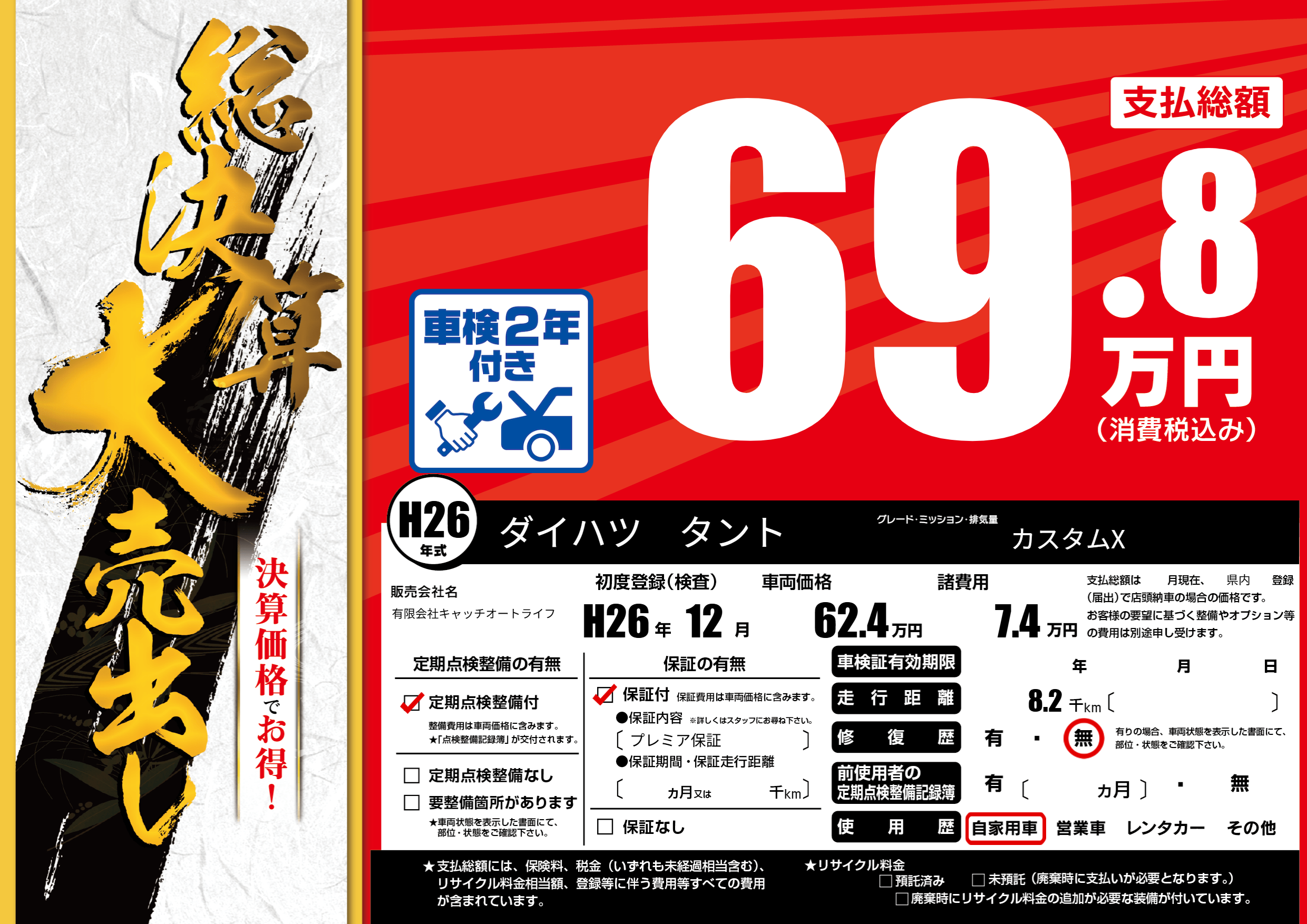 | 車名 | ダイハツ タント | グレード ミッション 排気量 |