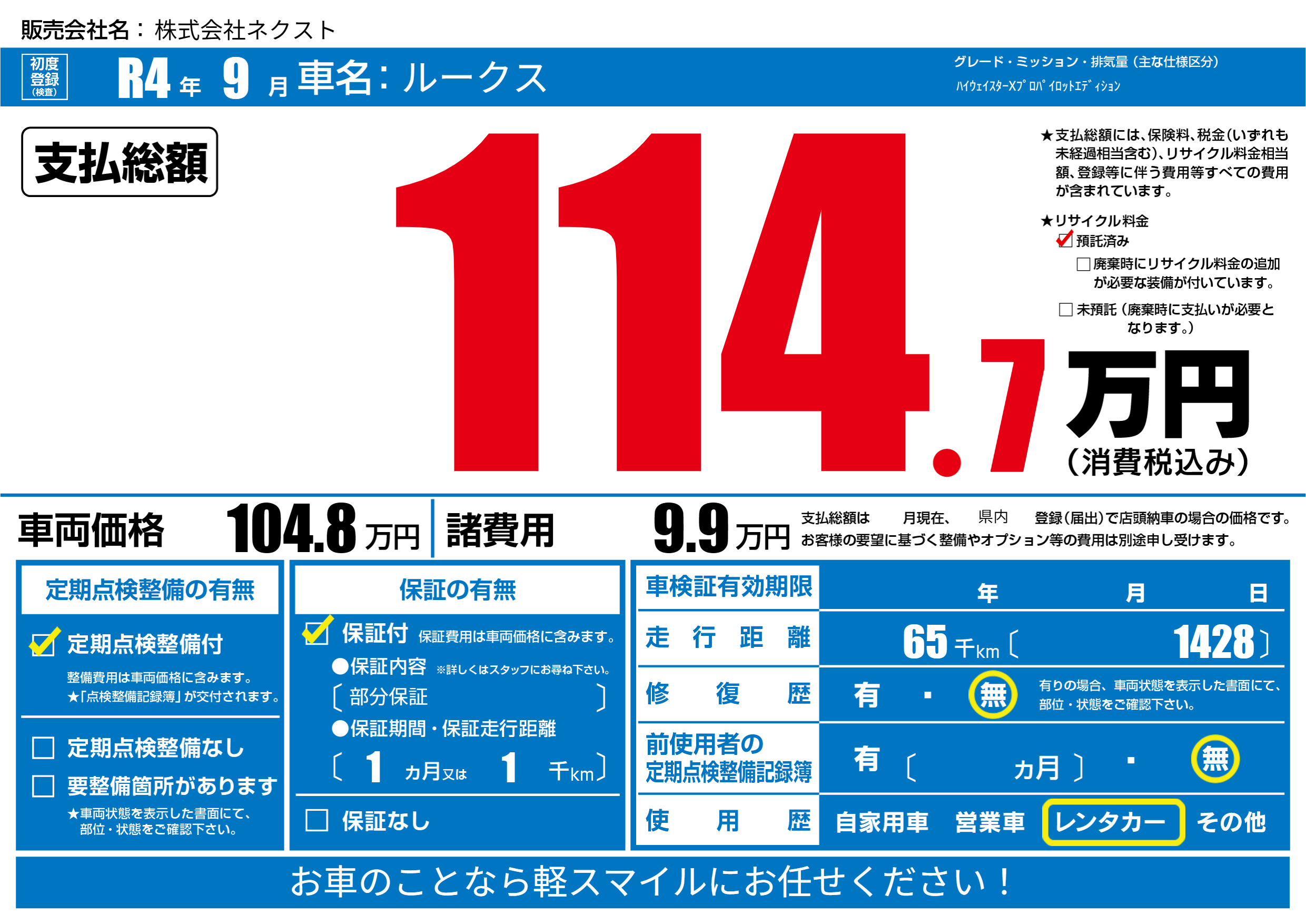 | 走行キロ | 6.5万km | 初年度登録 | R4年9月 |