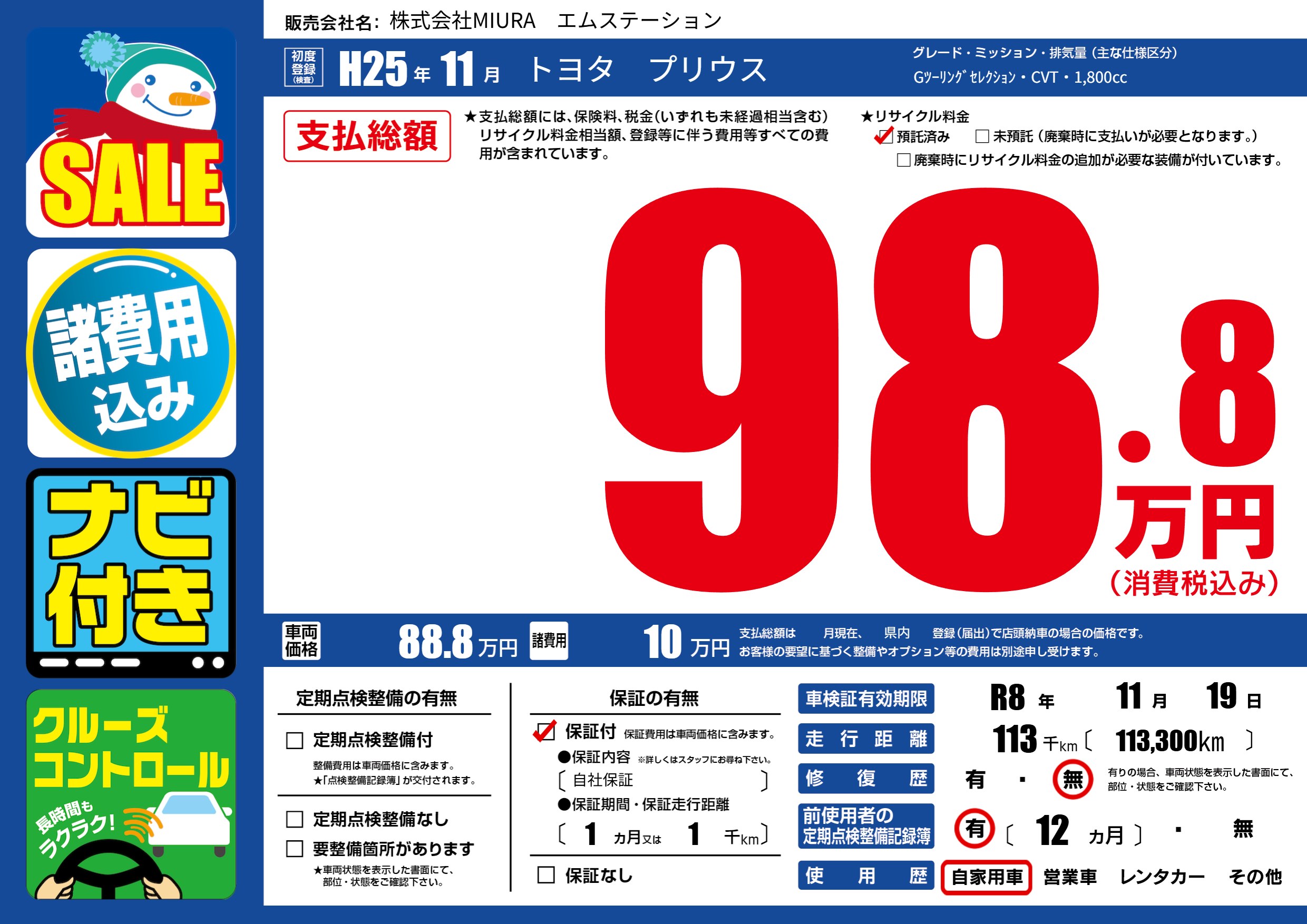 | 車名 | トヨタ プリウス | グレード ミッション 排気量 |