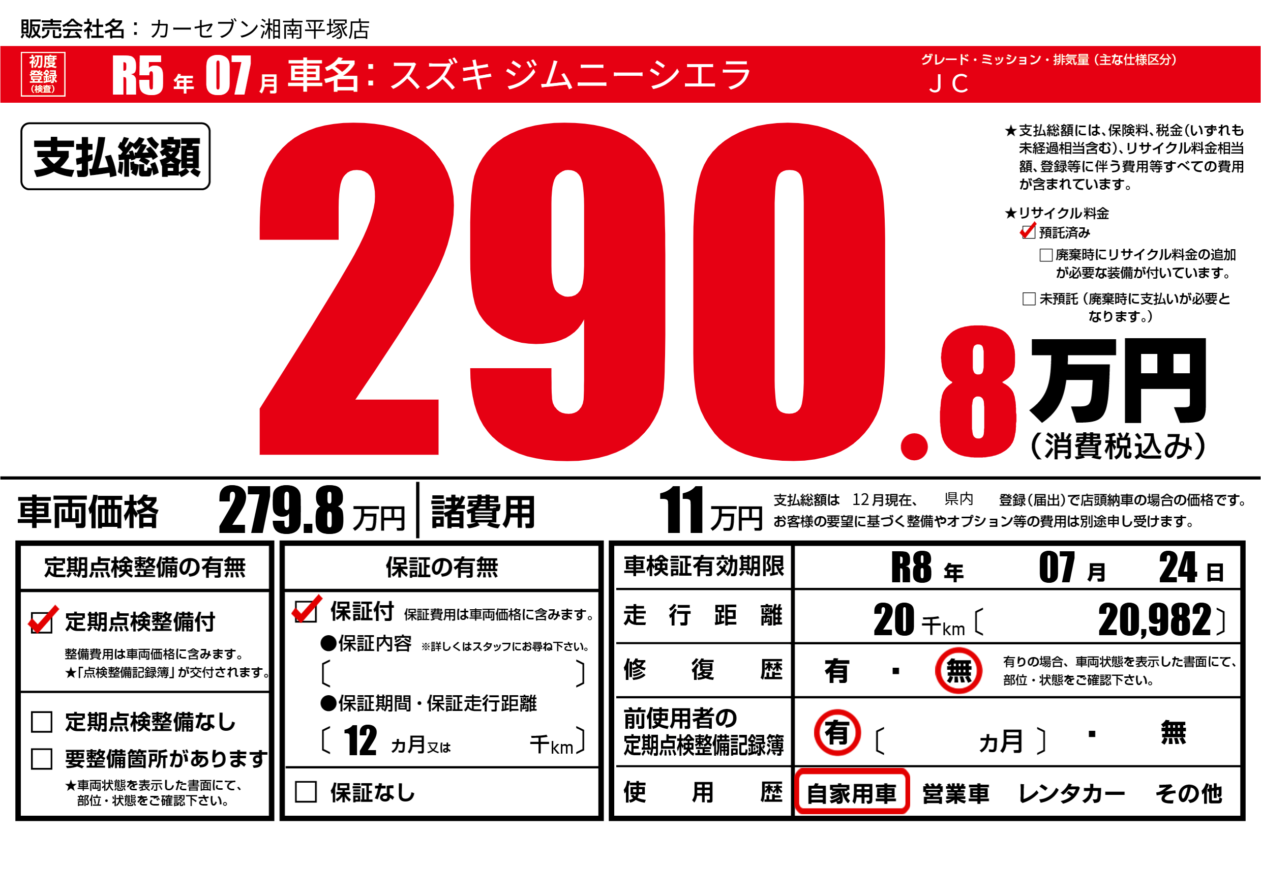 | 走行キロ | 2万km | 初年度登録 | R5年07月 |