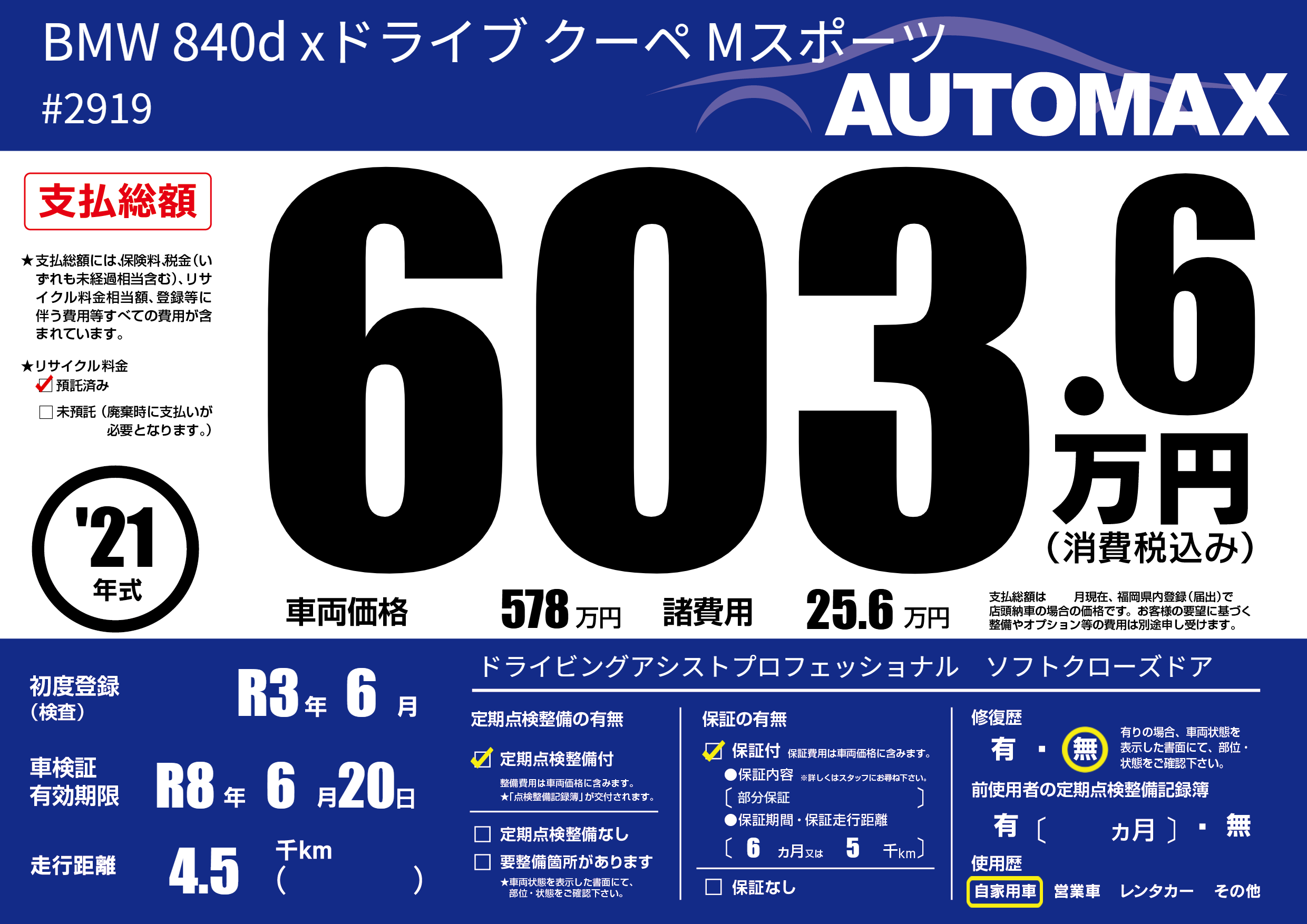 | 走行キロ | 0.4万km | 初年度登録 | R3年6月 |