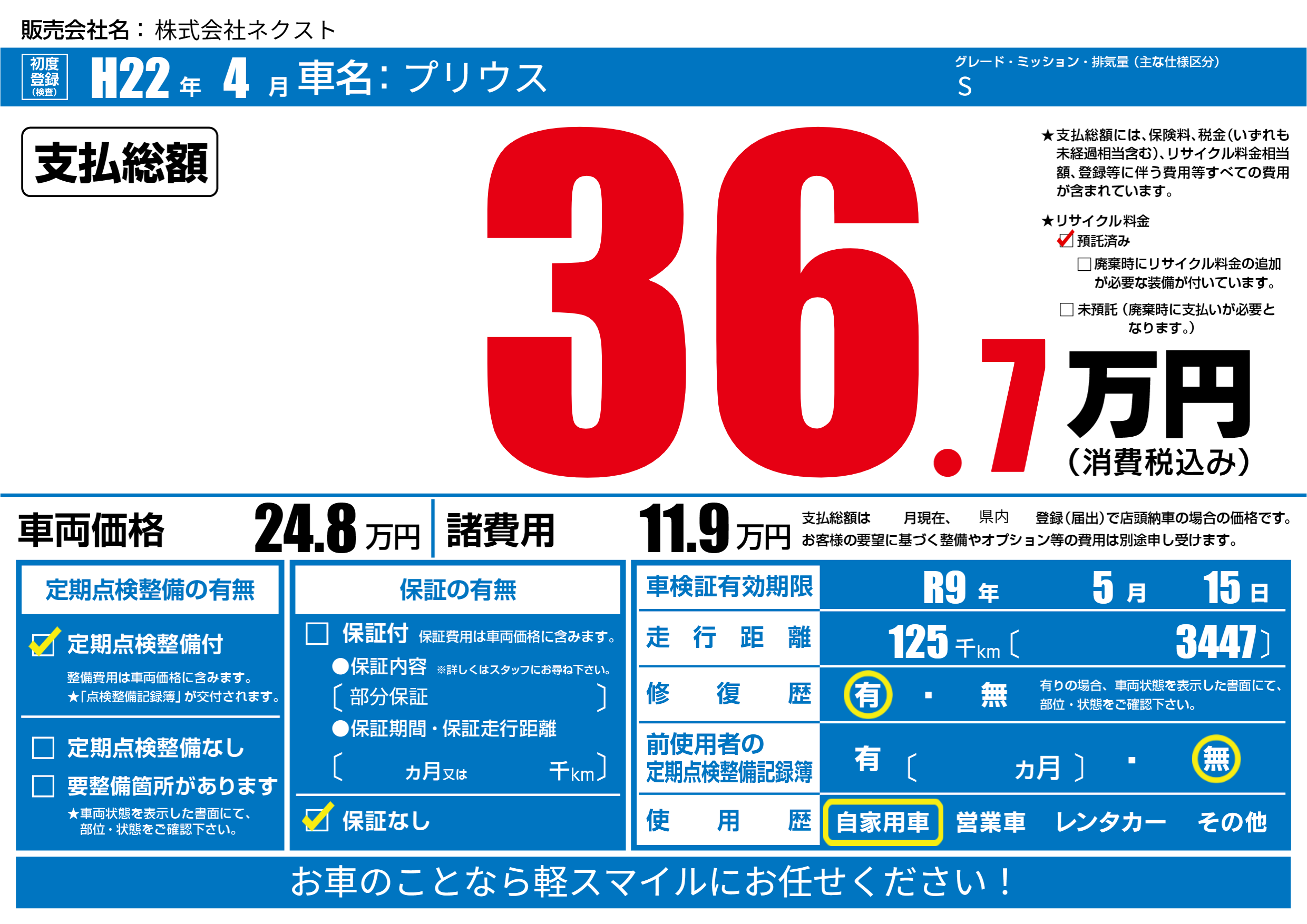 | 車名 | プリウス | グレード ミッション 排気量 |