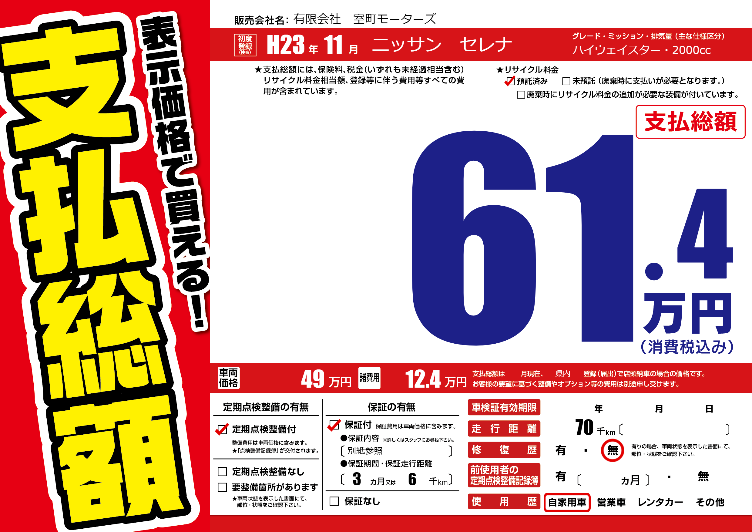 | 走行キロ | 7万km | 初年度登録 | H23年11月 |