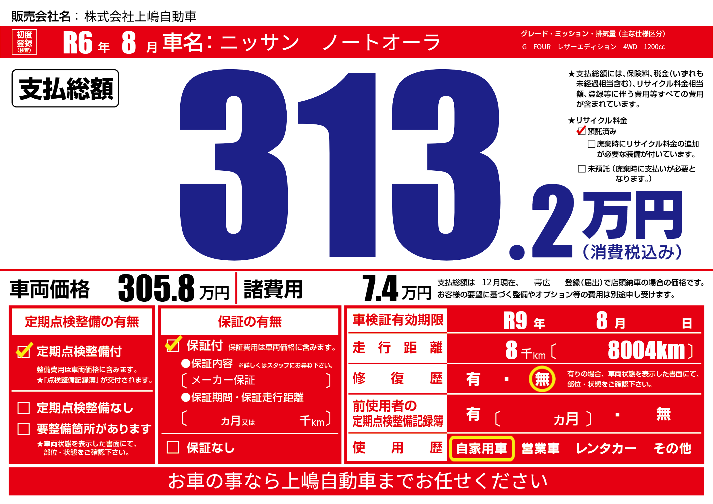 | 車名 | ニッサン ノートオーラ | グレード ミッション 排気量 |