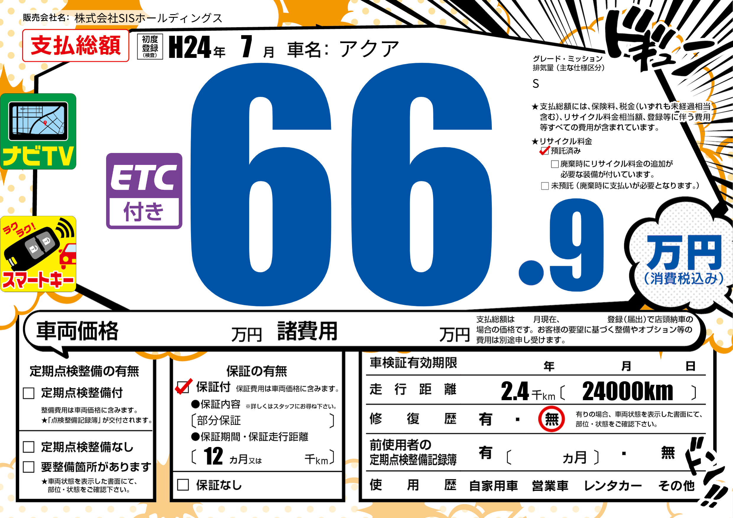 | 走行キロ | 0.2万km | 初年度登録 | H24年7月 |