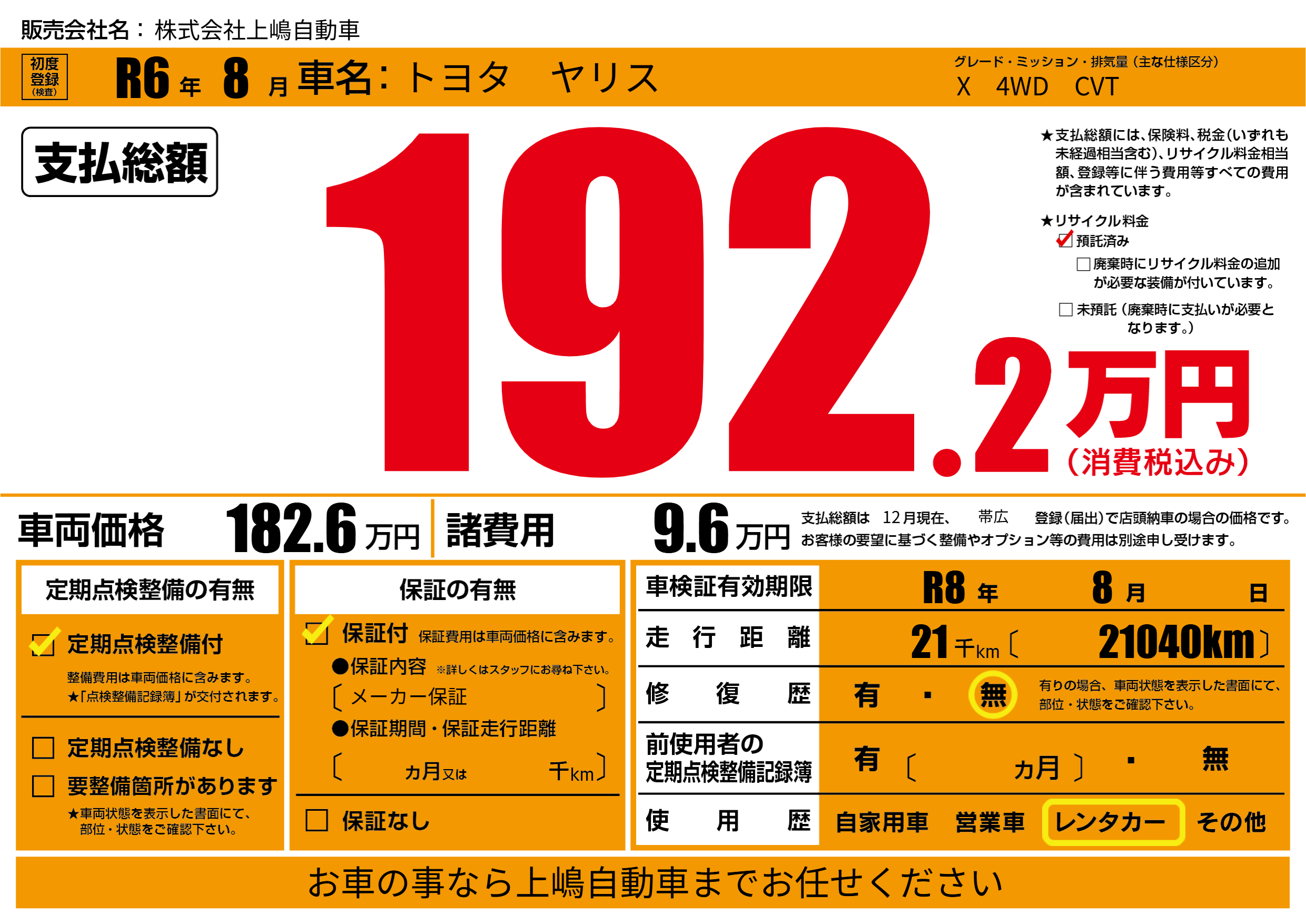 | 車名 | トヨタ ヤリス | グレード ミッション 排気量 |