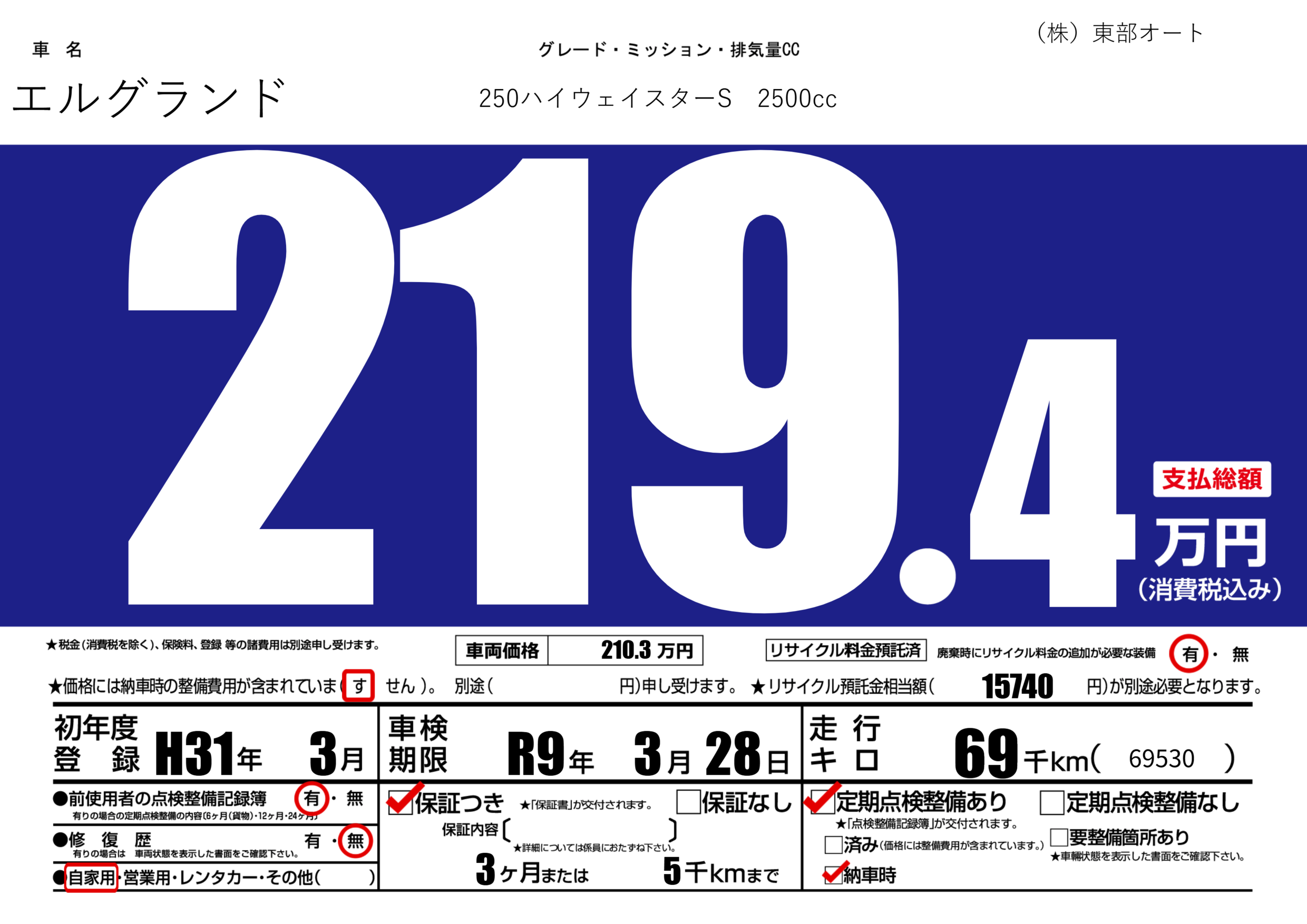 | 車名 | エルグランド | グレード ミッション 排気量 |