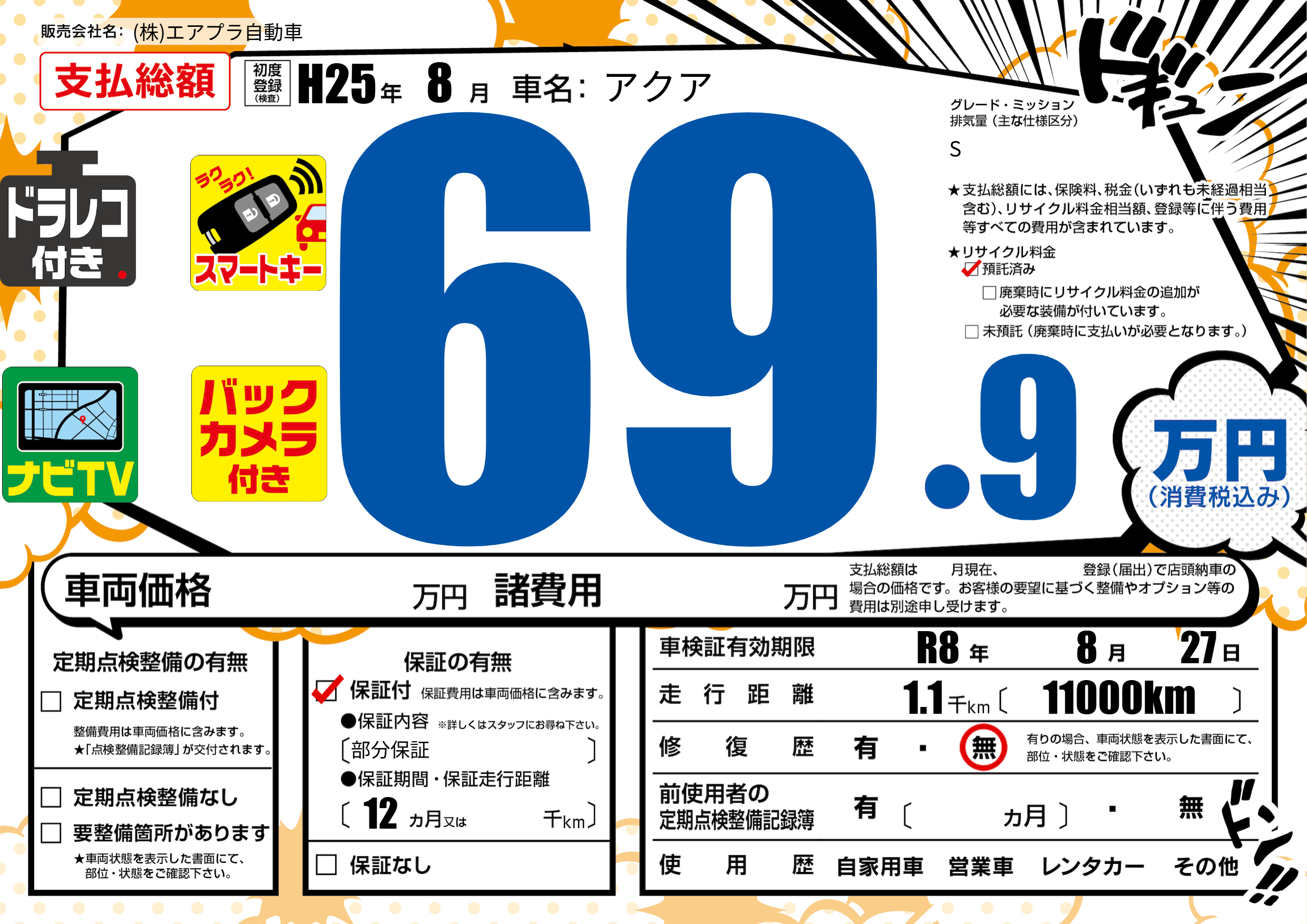 | 走行キロ | 0.1万km | 初年度登録 | H25年8月 |