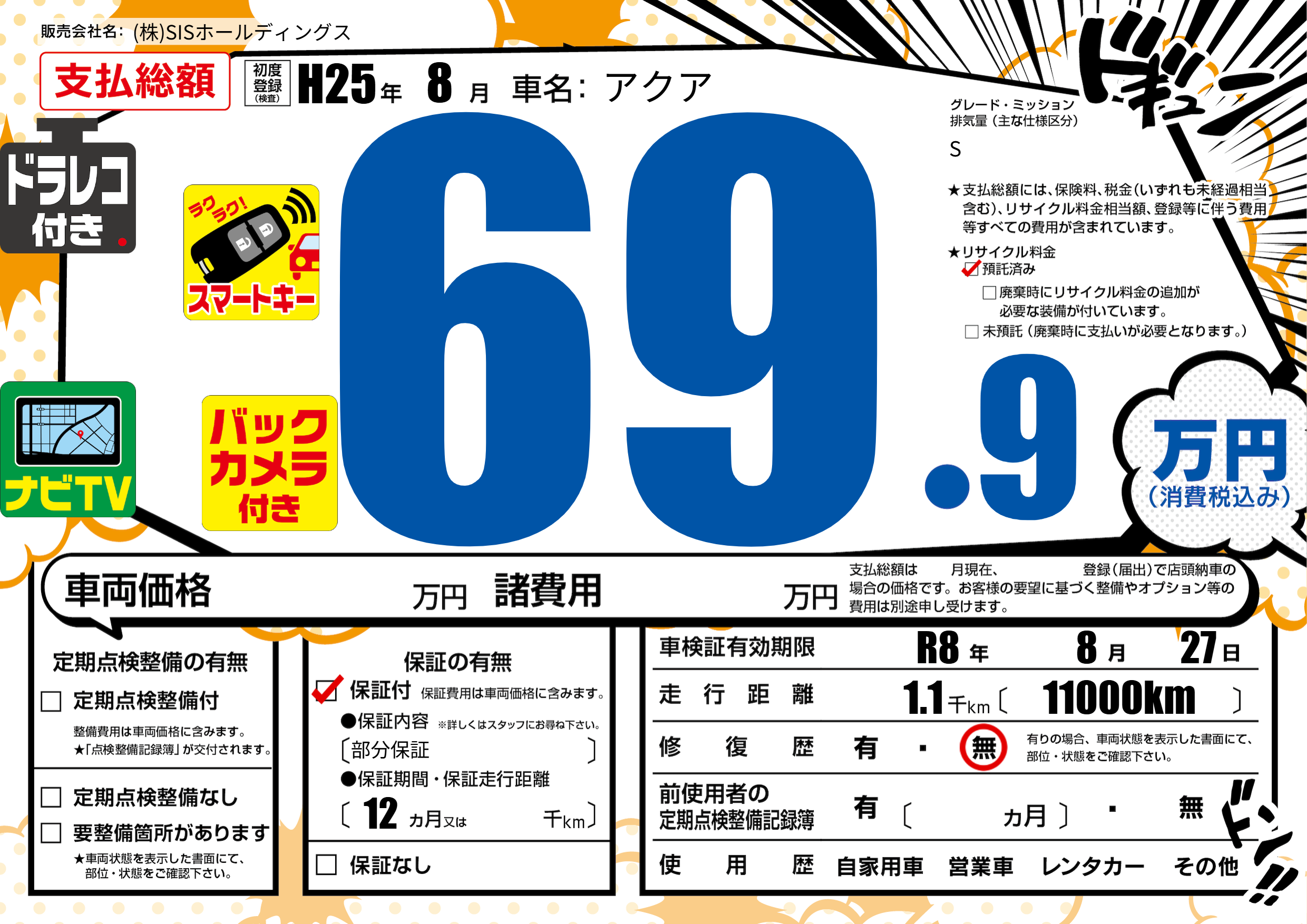 | 走行キロ | 0.1万km | 初年度登録 | H25年8月 |