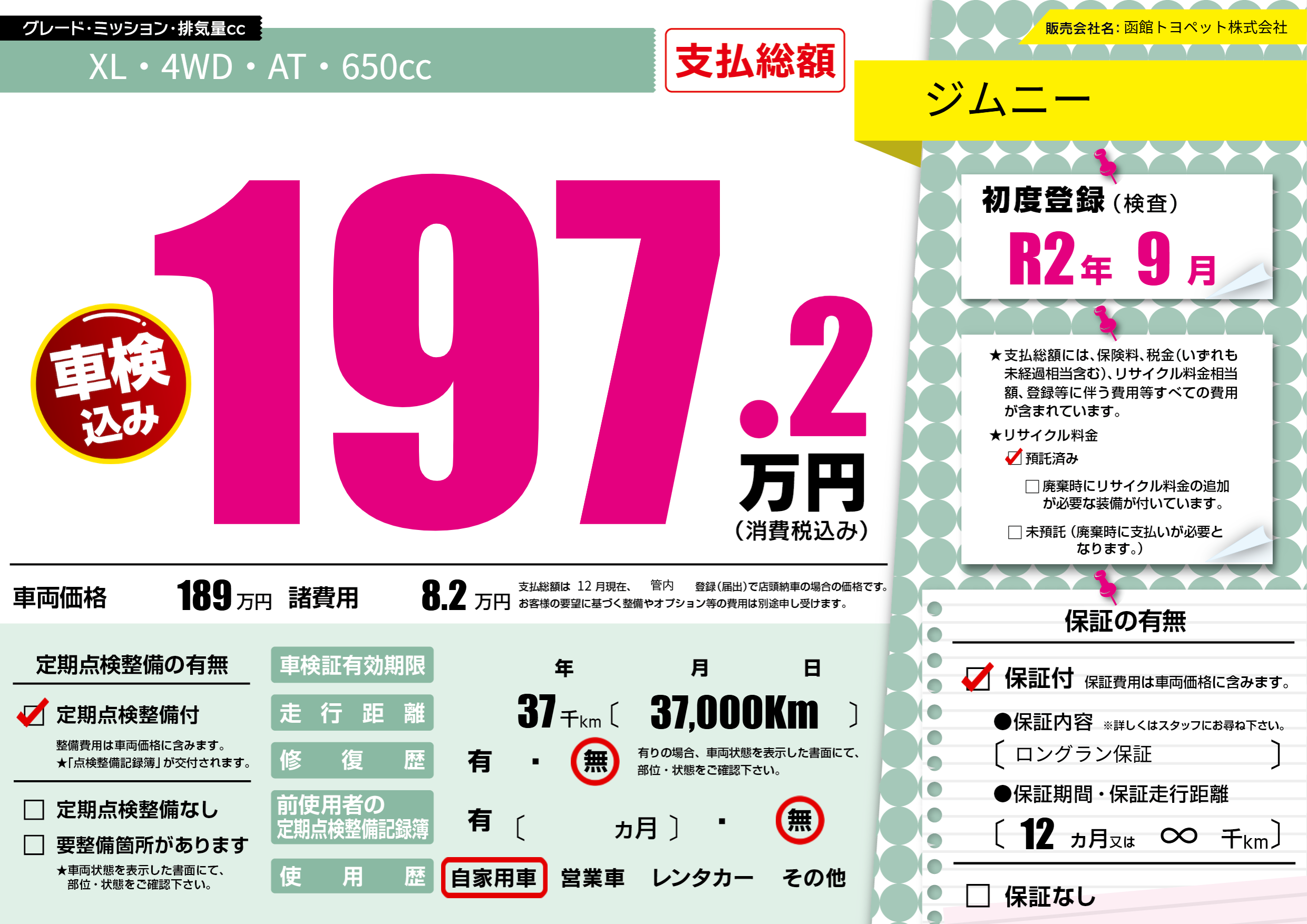 | 車名 | ジムニー | グレード ミッション 排気量 |