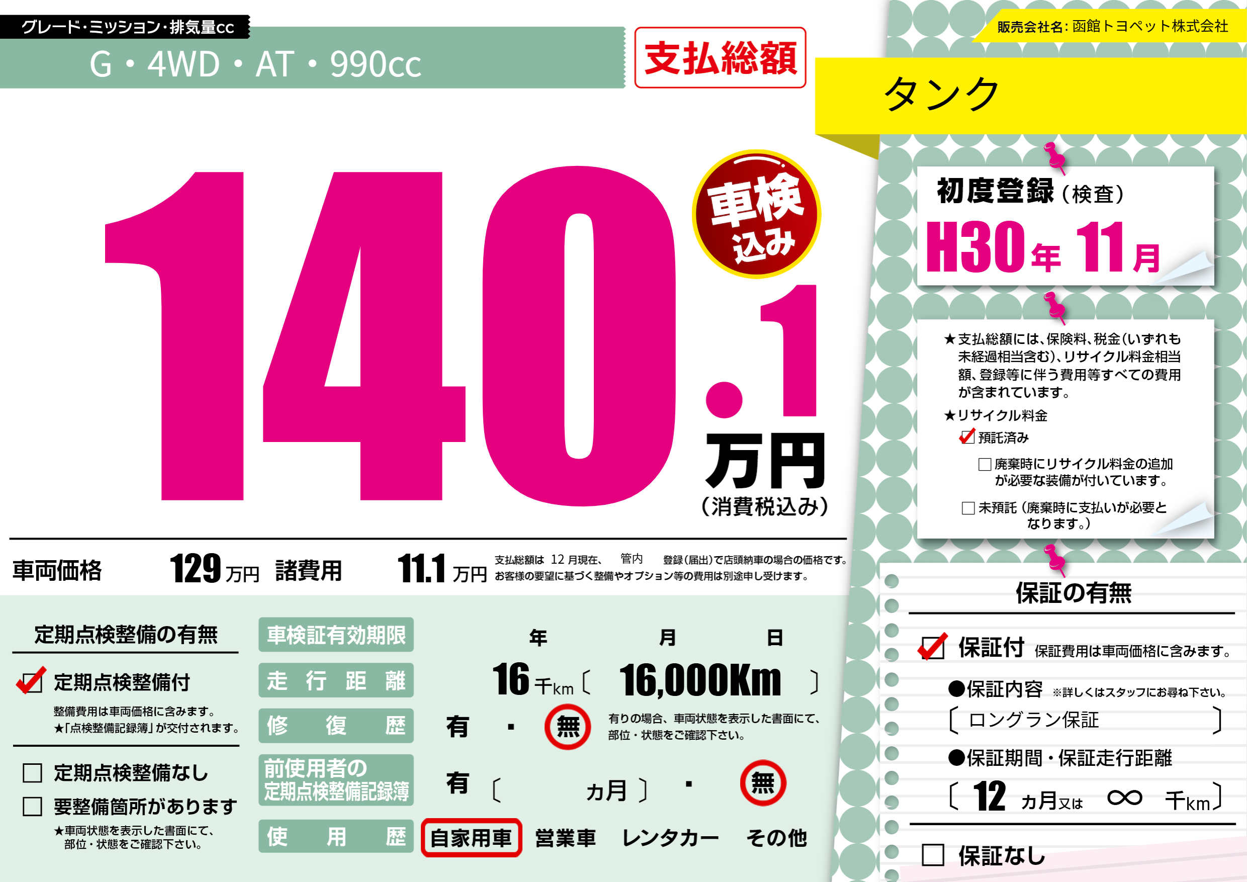 | 走行キロ | 1.6万km | 初年度登録 | H30年11月 |